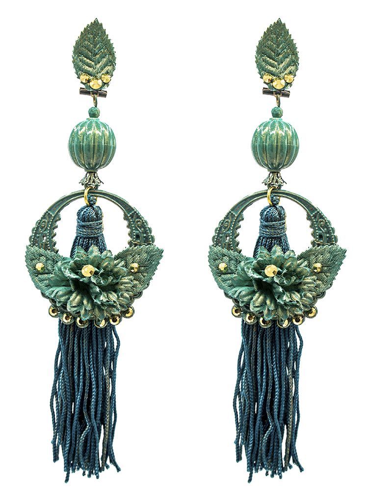 Pendiente de flamenca en forma de aro, en tonos verde con reflejos dorados, detalle floral en tela, fornitura y bolas metálicas. Terminación en flecos. Cierre omega. Medidas: 50 x 110 mm (sin cabezal). Fabricado artesanalmente en Sevilla.