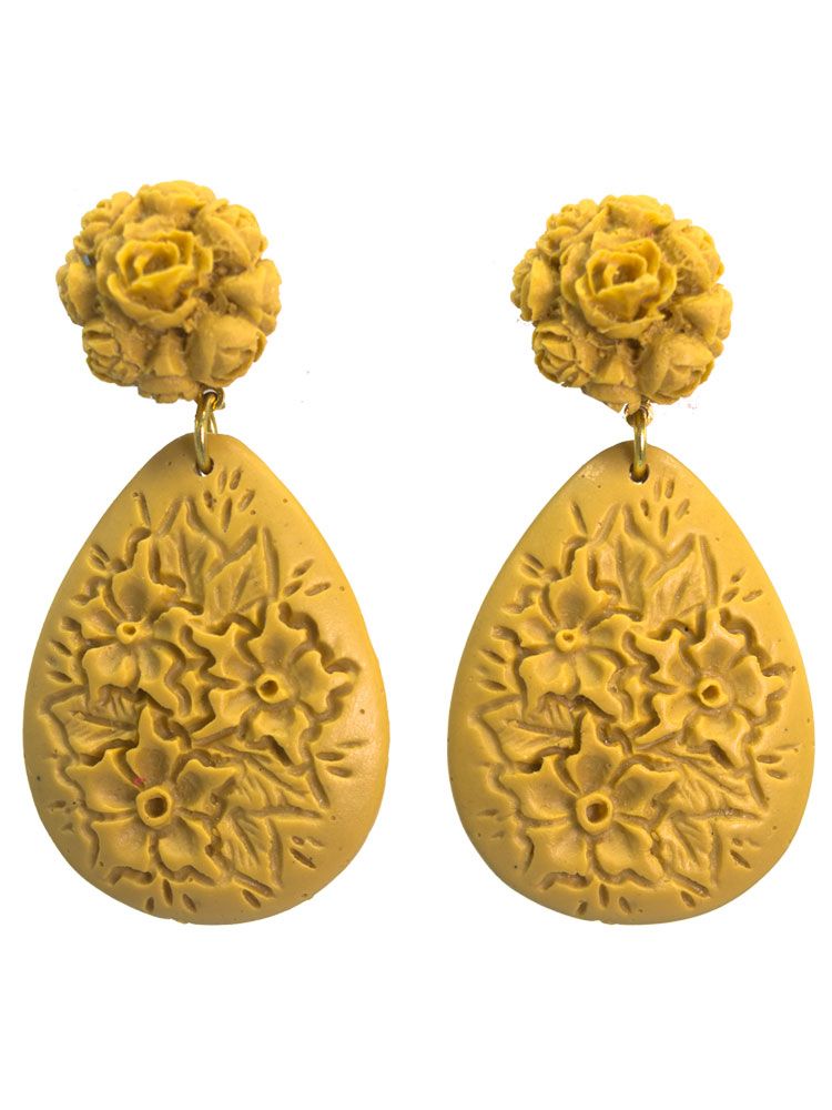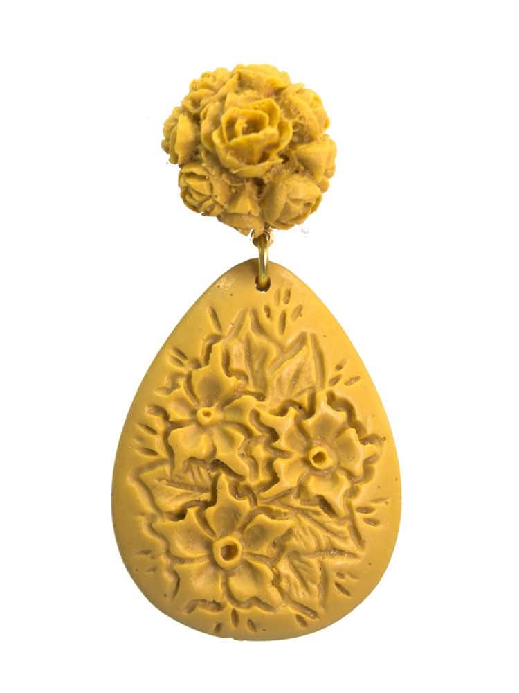 Pendiente de flamenca en forma de lágrima de resina con detalle floral en color camel. Detalle floral. Cierre mariposa. Medidas: 30 x 40 mm (sin cabezal). Fabricado artesanalmente en Sevilla.