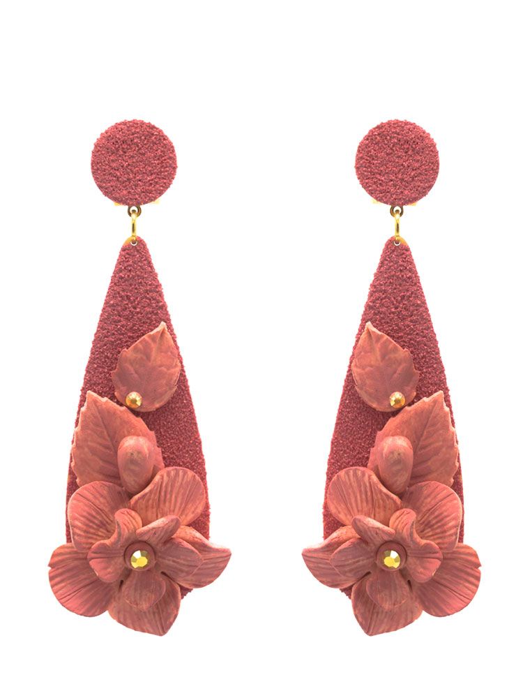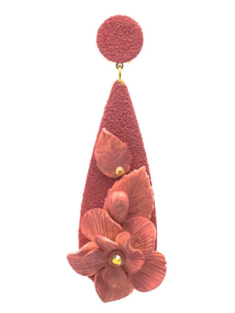 Pendiente de flamenca lágrima con flor de porcelana fría tono maquillaje con piedras doradas. Base decorada con polvo de nácar sobre acetato. Cierre omega. Medidas: 35 x 75 mm (sin cabezal). Fabricado artesanalmente en Sevilla.