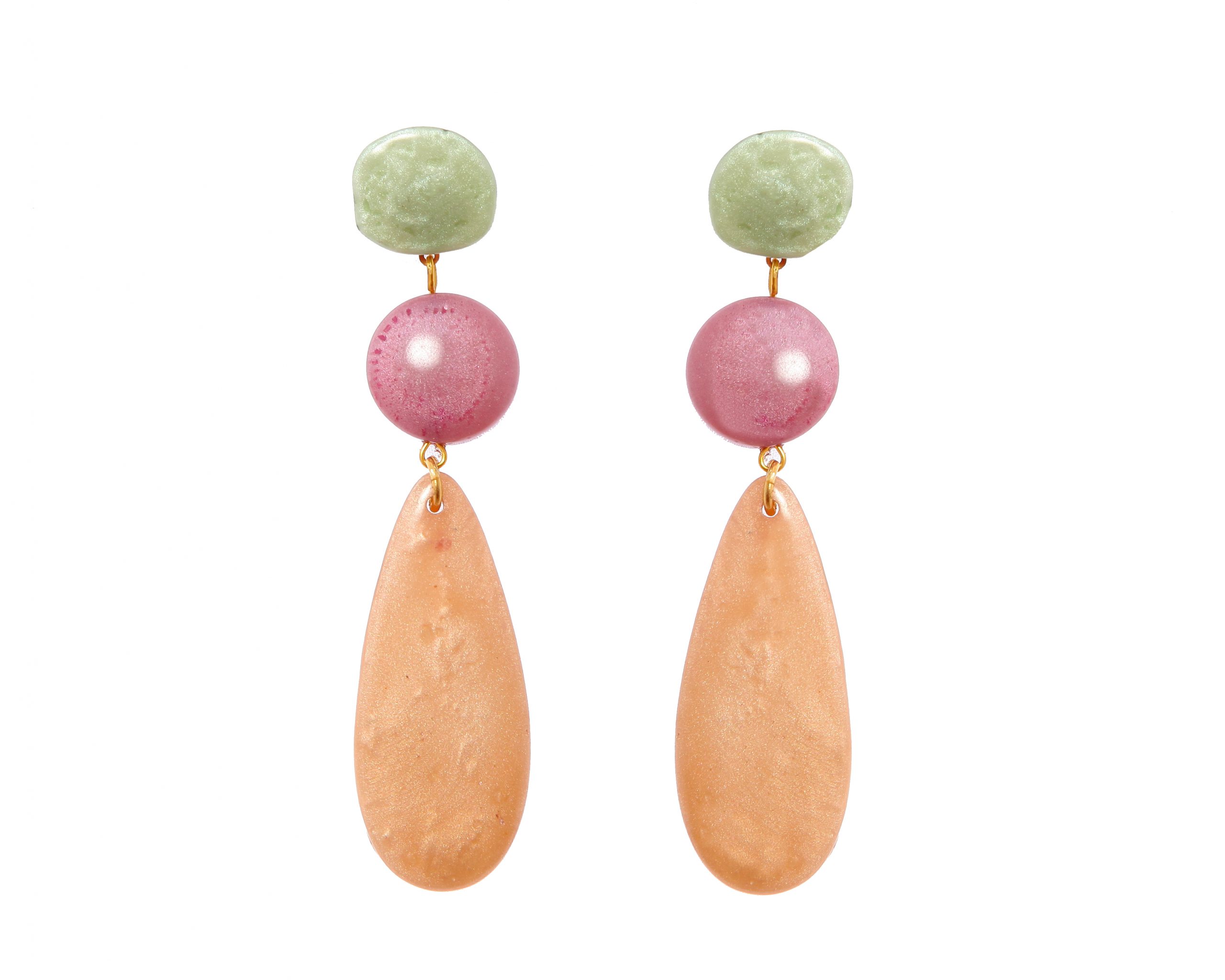 Pendiente de flamenca lágrima grande piedras nácar color verde agua, malva y beige