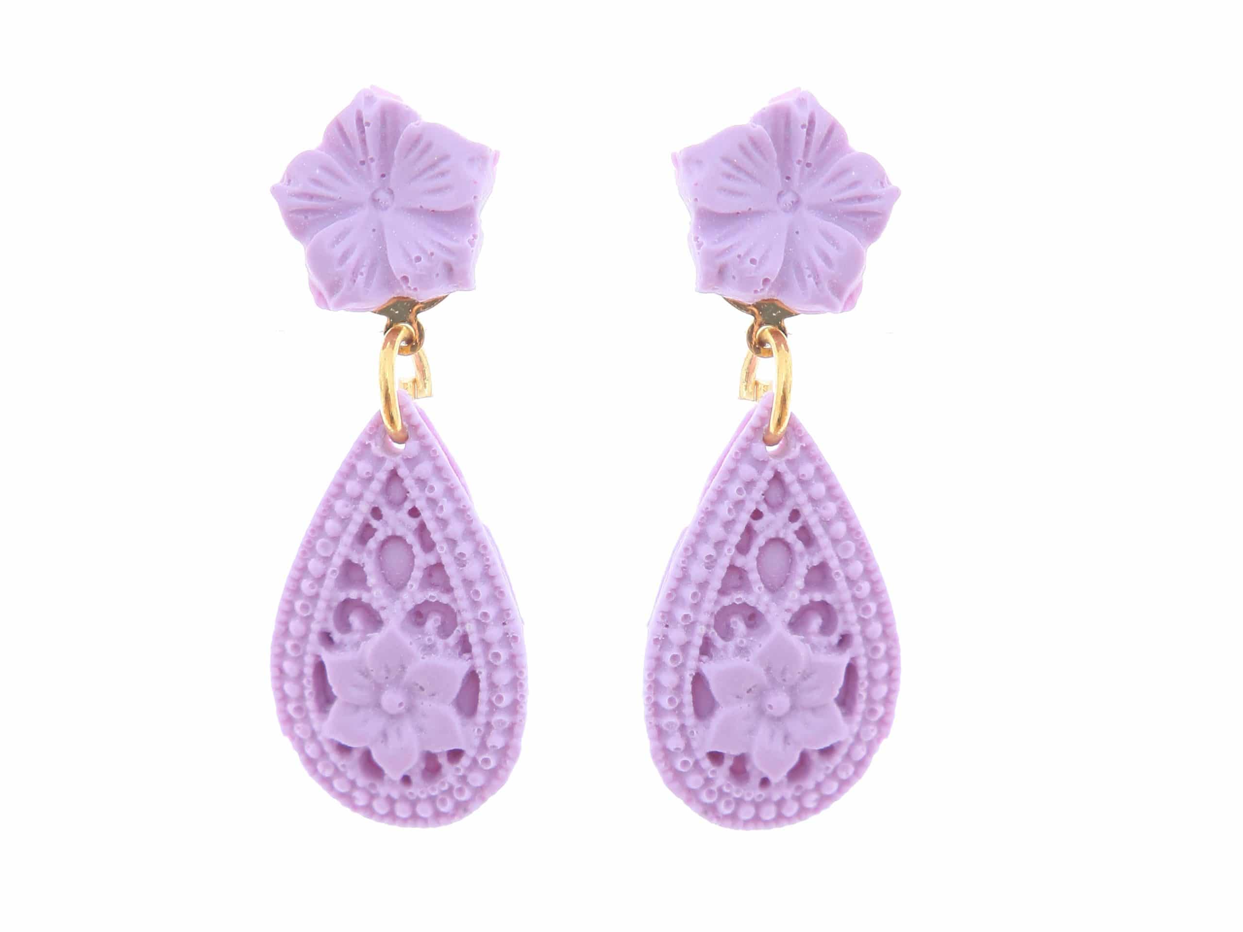 Pendiente de flamenca lagrima mediana de resina color malva. Cierre a presión. Medida 27×10 mm (con cabezal). Fabricado artesanalmente en la provincia de Sevilla.