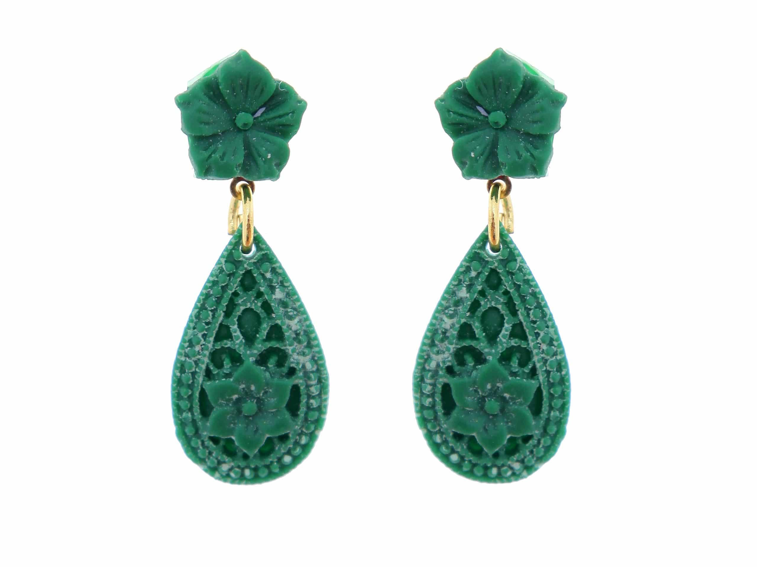 Pendiente de flamenca lagrima mediana de resina color verde. Cierre a presión. Medida 27×10 mm (con cabezal). Fabricado artesanalmente en la provincia de Sevilla.