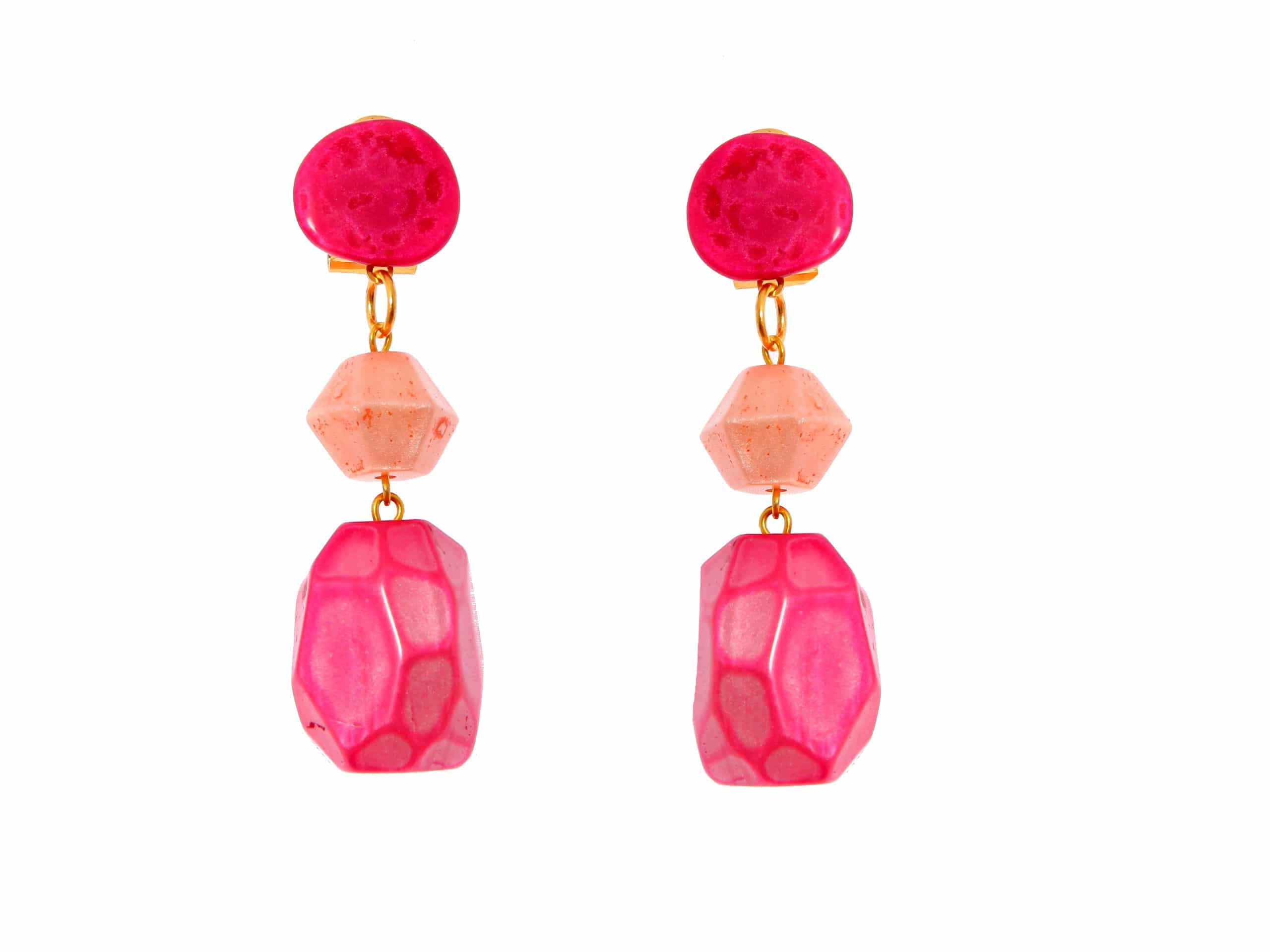 Pendiente de flamenca mediano piedras nácar color buganvilla y rosa bebé. Cierre omega. Medida 23×60 mm (con cabezal). Fabricado artesanalmente en la provincia de Sevilla.