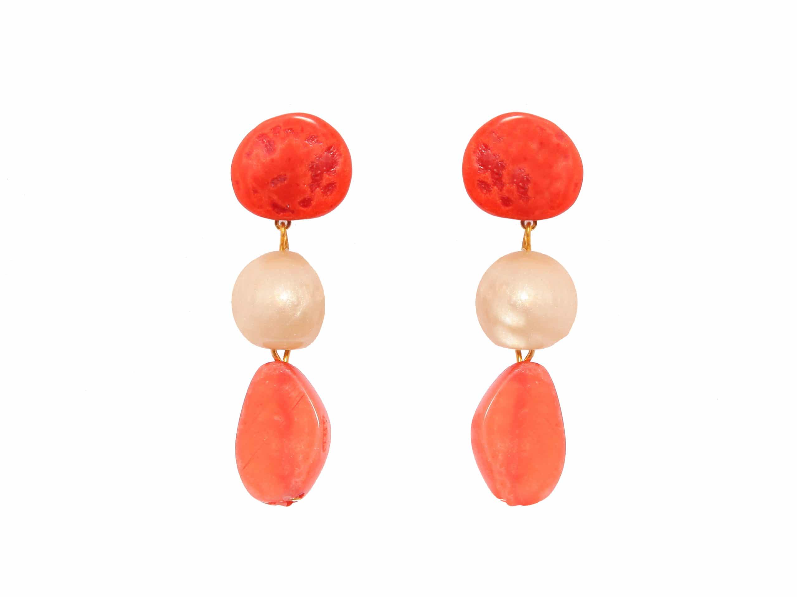 Pendiente de flamenca mediano piedras nácar color coral y beige. Cierre a presión. Medida 15×58 mm (con cabezal). Fabricado artesanalmente en la provincia de Sevilla.
