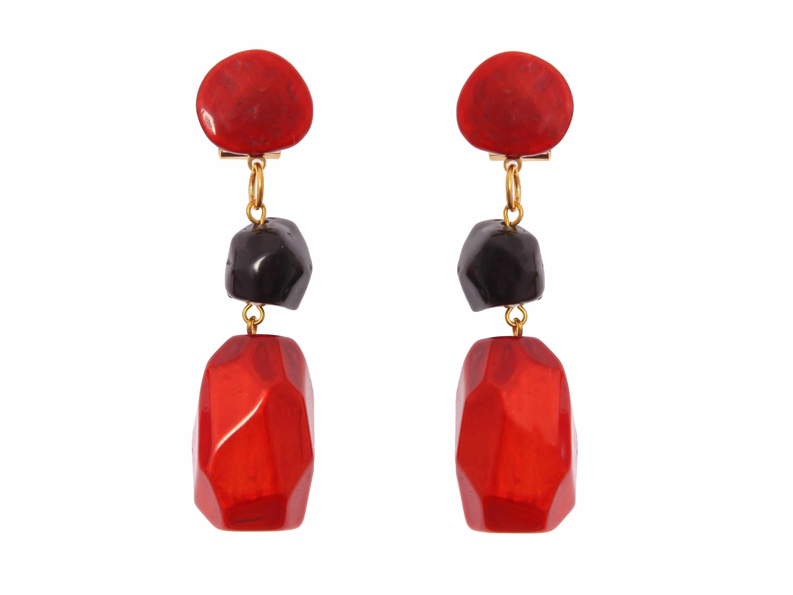 Pendiente de flamenca mediano piedras nácar color coral y negro. Cierre omega. Medida 23×60 mm (con cabezal). Fabricado artesanalmente en la provincia de Sevilla.