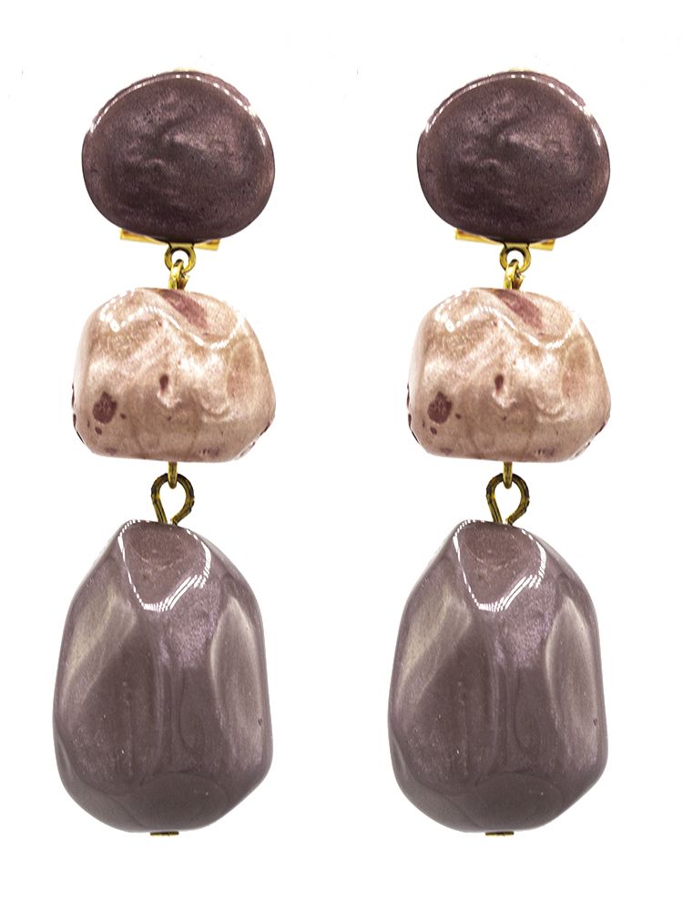 Pendiente de flamenca mediano piedras nácar color malva y maquillaje oscuro. Cierre omega. Medida 20×45 mm (sin cabezal). Fabricado artesanalmente en la provincia de Sevilla.