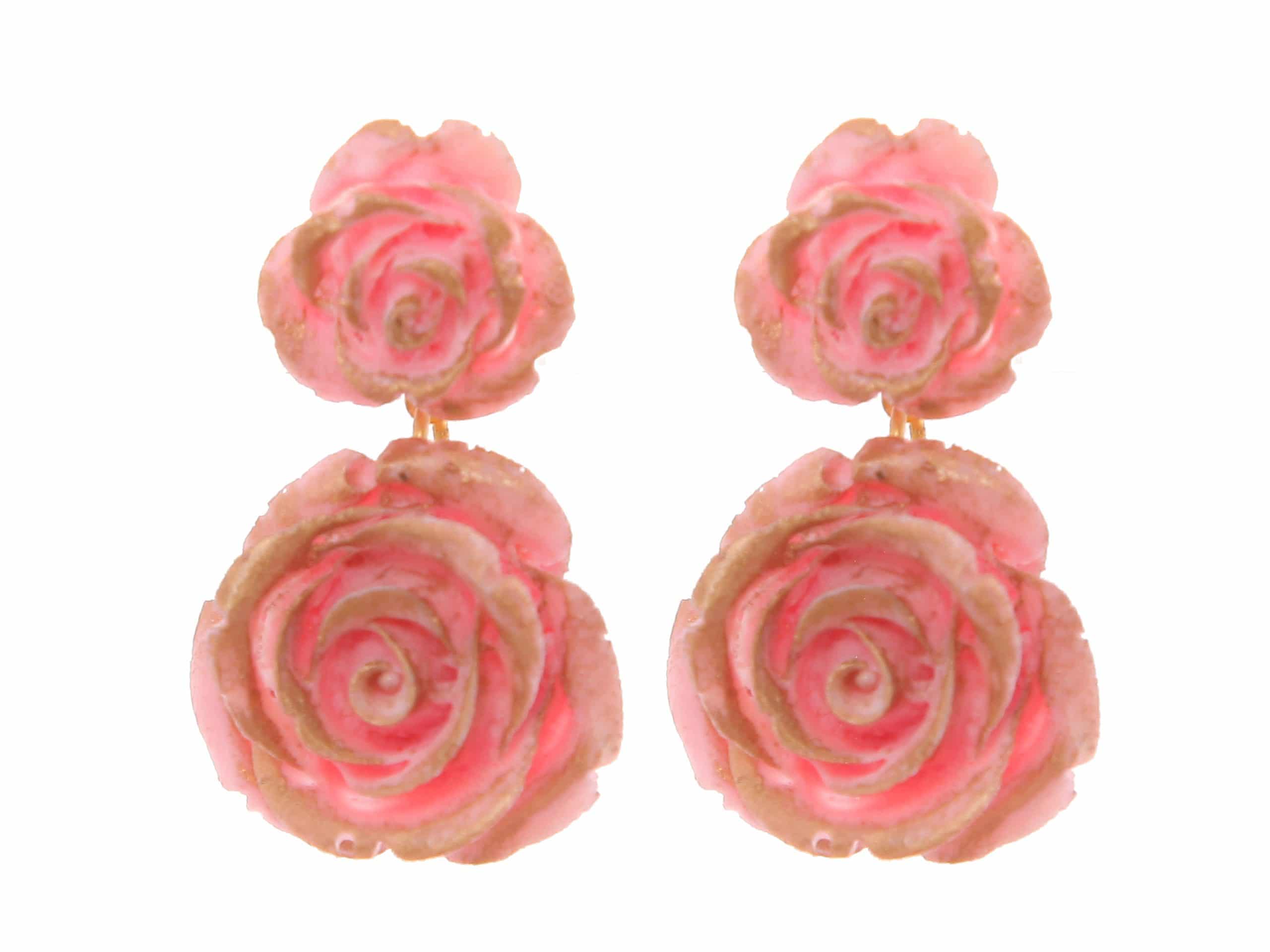 Pendiente de flamenca pequeño de resina color rosa y dorado. Cierre a presión. Medida 20×12 mm (con cabezal). Fabricado artesanalmente en la provincia de Sevilla.