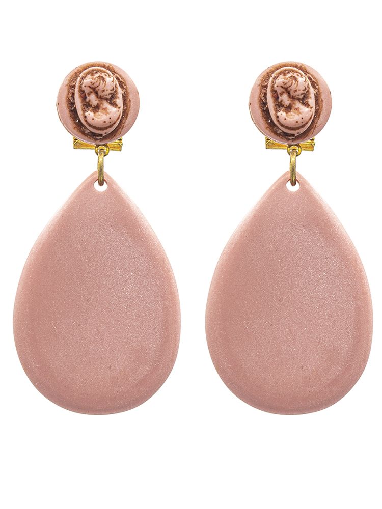 Pendiente de flamenca en forma de lágrima pequeña, de resina, en color maquillaje, con adorno en el cabezal y unas medias de 45 x 30 mm (sin cabezal). Fabricado artesanalmente en Sevilla.