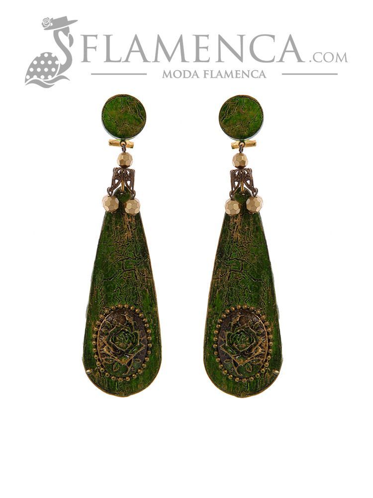 Pendiente de flamenca en color verde oliva envejecido, forma de lágrima, detalle floral, fornitura metálica, cierre omega, y con medidas: 29 x 90 mm (sin cabezal). Fabricado artesanalmente en Sevilla.