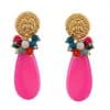 Pendiente de lágrima naranja con bolas de piedra Ágata en multicolor y cabezal de moneda en oro mate. Cierre de tornillo. Medidas aproximadas ancho x largo,20 x70mm (con cabezal). Fabricado artesanalmente en la provincia de Sevilla.