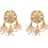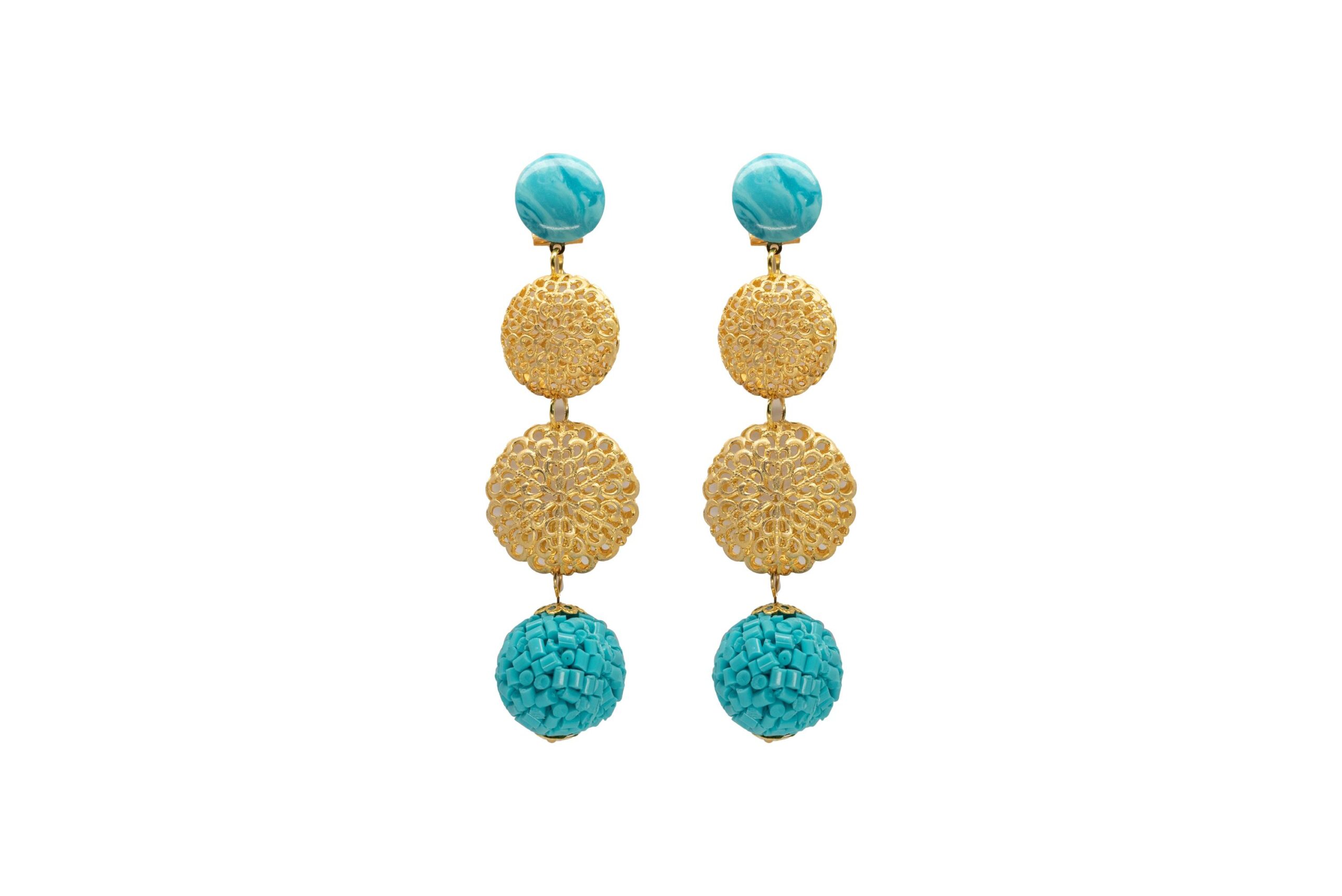 Pendiente dorado de dos círculos labrados, esfera final turquesa y aplique estilo acuarela. Cierre omega. Medidas x (cabezal incluido) Fabricados artesanalmente en la provincia de Sevilla.