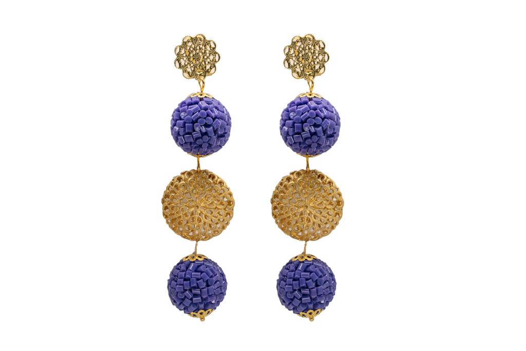 Pendiente dorado de dos esferas moradas con círculo labrado central y aplique dorado labrado. Cierre omega. Medidas x (cabezal incluido) Fabricados artesanalmente en la provincia de Sevilla.