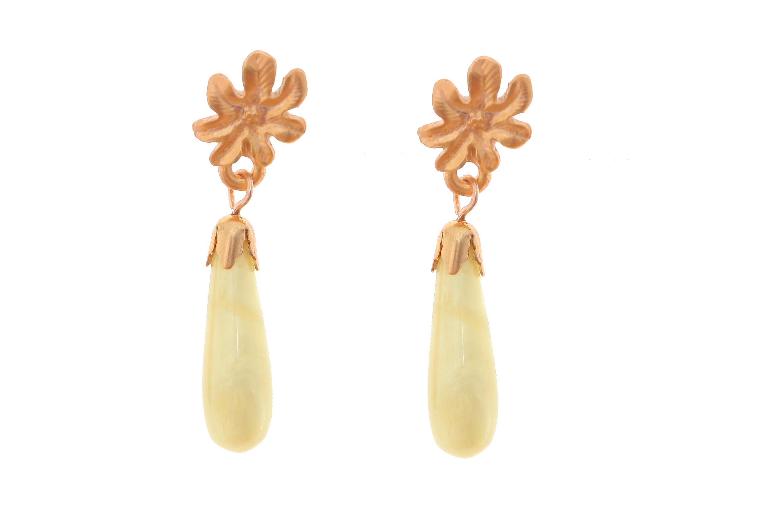 Pendiente lágrima color amarillo pálido con cabezal de flor pequeña Cierre de tornillo. Medida 15×50 mm (con cabezal). Fabricado artesanalmente en la provincia de Sevilla.