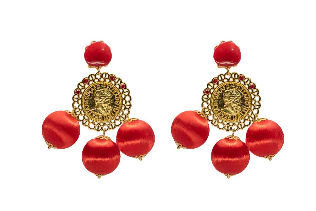 Pendientes con colgante de moneda dorada decorada con detalles en rojo y borde calado. Cabezal circular en rojo con acabado brillante. Tres cuentas negras facetadas cuelgan del colgante, añadiendo volumen y movimiento al diseño. Cierre omega. Medidas aproximadas: 6,5 x 7,7 cm