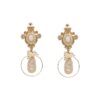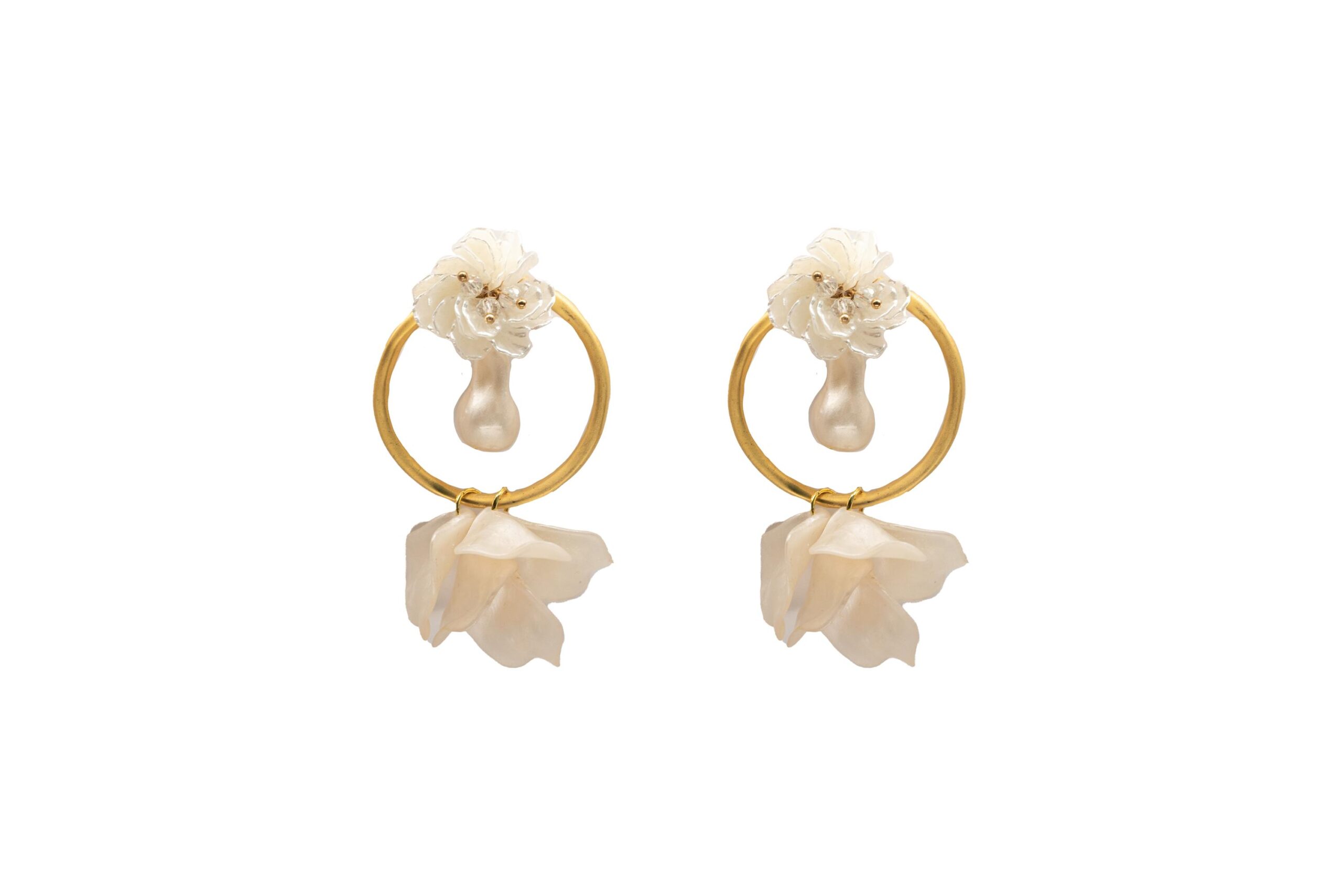 Pendientes de aro dorado con aplique de flor blanca y perla en el centro y pétalos blancos.