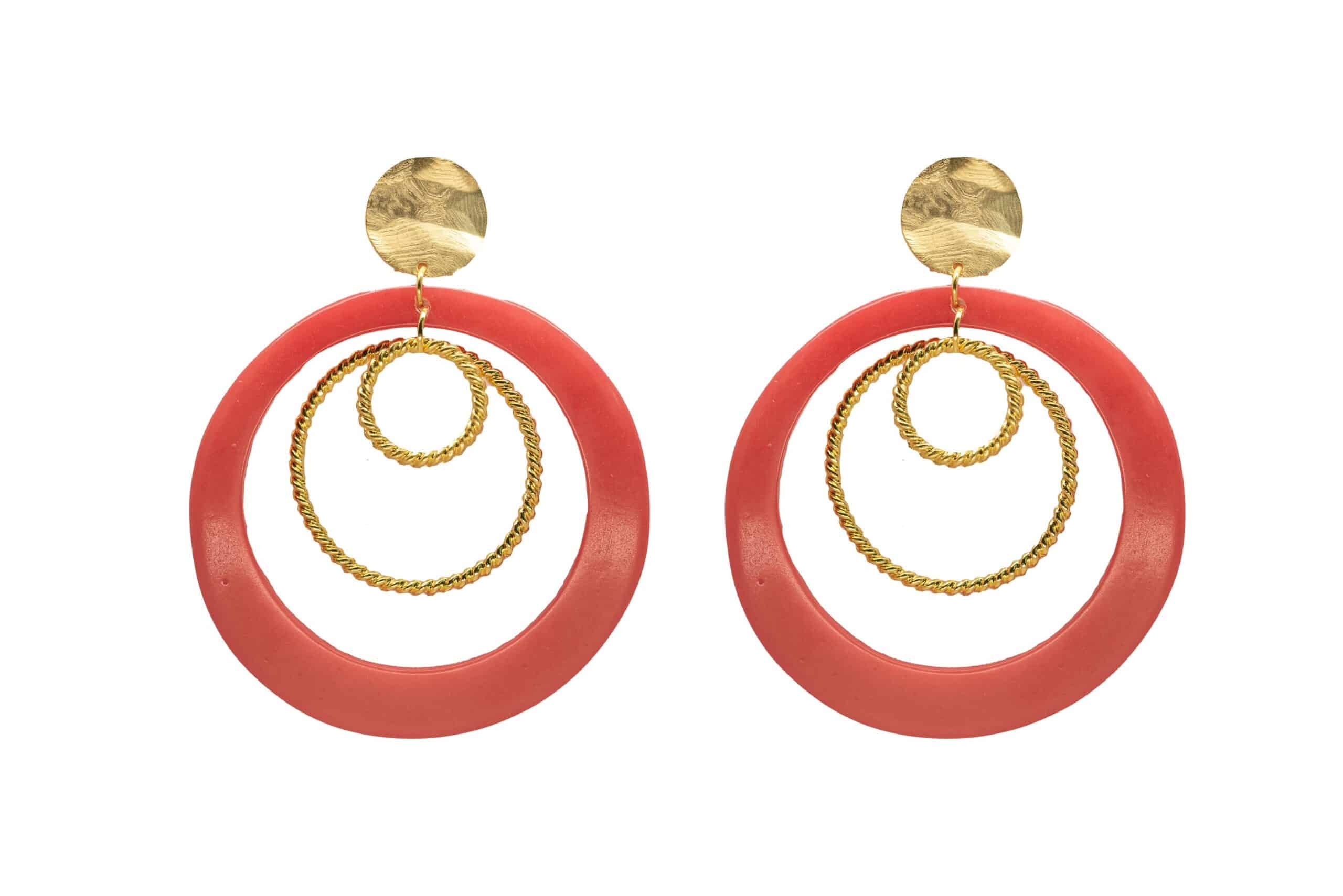 Pendientes de aro, con circunferencia exterior de acetato color coral , y dos aros interiores de menor tamaño rizados con aplique dorado. Cierre omega. Medidas 7×8,5 (cabezal incluido) Fabricados artesanalmente en la provincia de Sevilla.