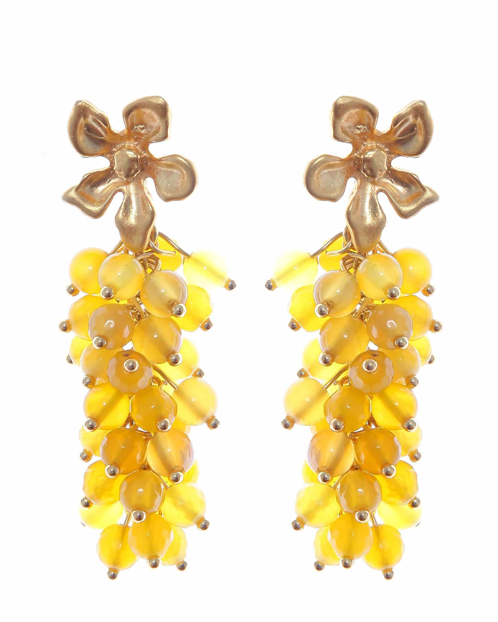 Pendientes de bolas de piedras Ágata amarillas con cabezal de flor con acabado en oro mate. Cierre de tornillo. Medidas aproximadas ancho x largo,15 x70mm (con cabezal). Fabricado artesanalmente en la provincia de Sevilla.
