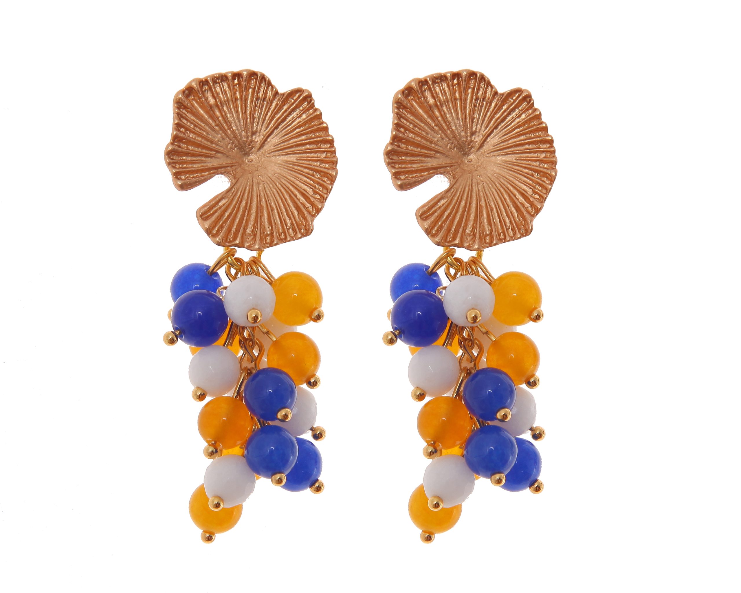 Pendientes de bolas de piedras Ágata azul, mostaza y blanca con cabezal de nenúfar con acabado en oro mate. Cierre de tornillo. Medidas aproximadas ancho x largo, 25 x60mm (con cabezal). Fabricado artesanalmente en la provincia de Sevilla.
