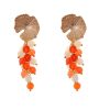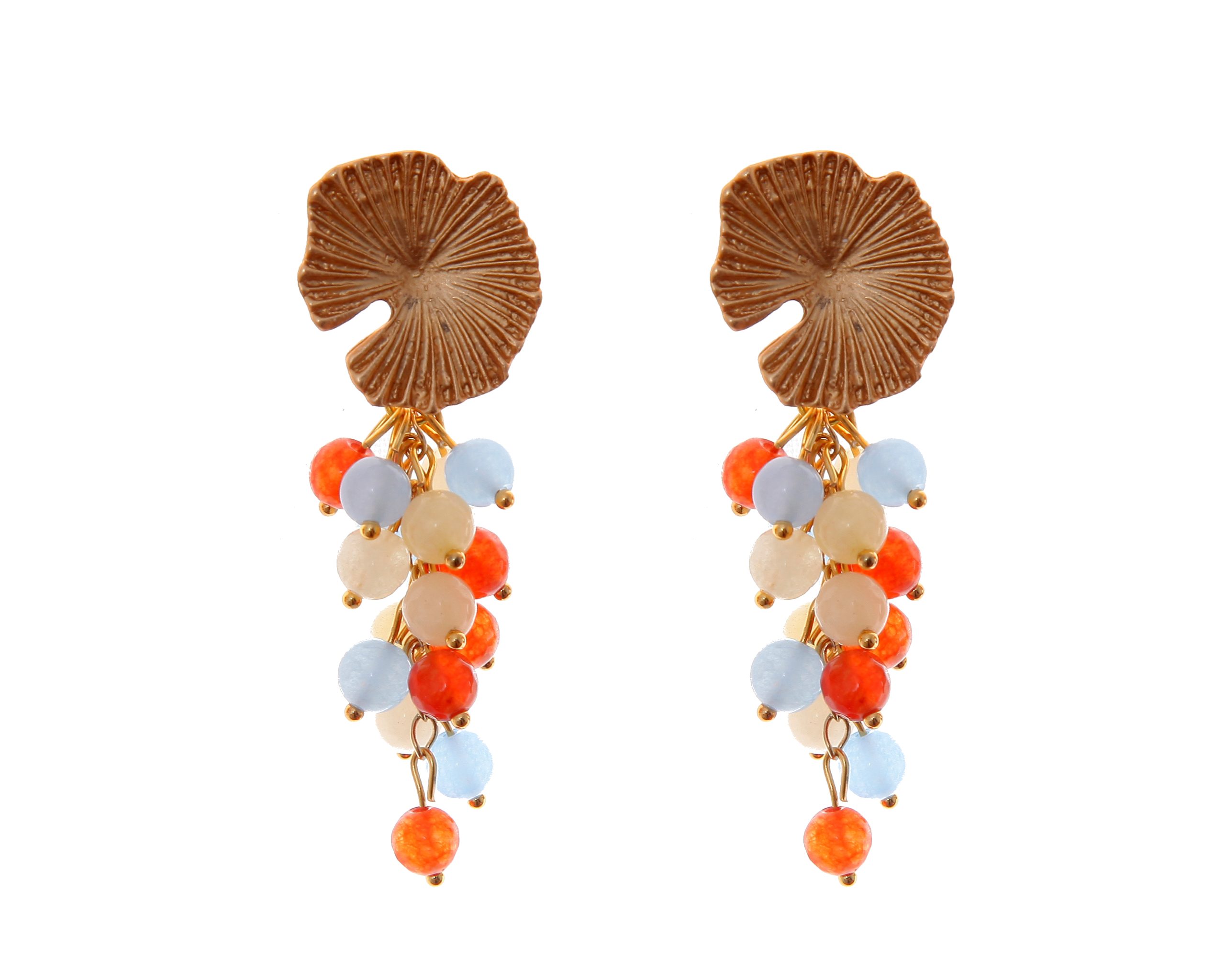 Pendientes de bolas de piedras Ágata celeste, naranja y beige con cabezal de nenúfar con acabado en oro mate. Cierre de tornillo. Medidas aproximadas ancho x largo, 25 x60mm (con cabezal). Fabricado artesanalmente en la provincia de Sevilla.