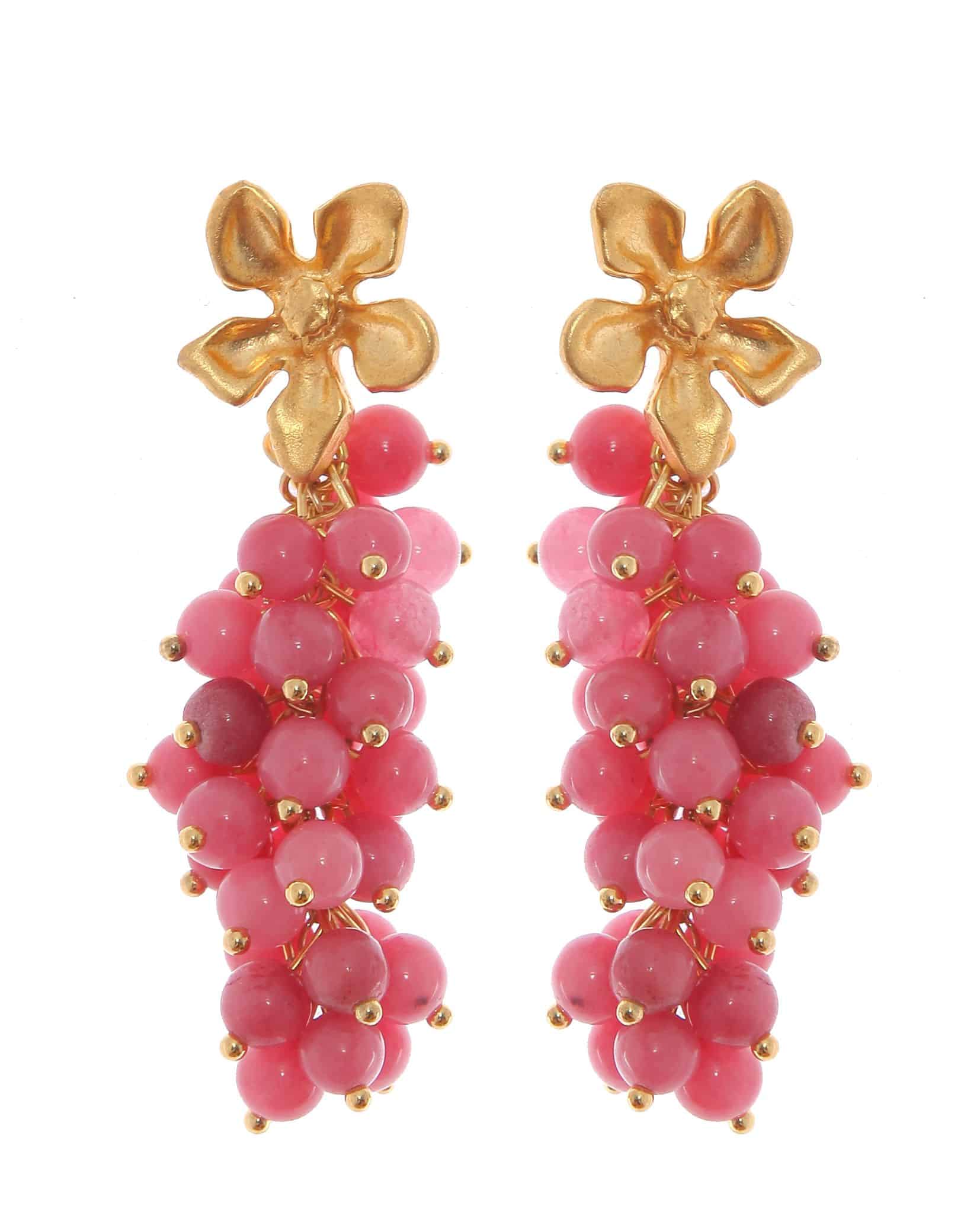 Pendientes de bolas de piedras Ágata en rosa bebé con cabezal de flor con acabado en oro mate. Cierre de tornillo. Medidas aproximadas ancho x largo,15 x70mm (con cabezal). Fabricado artesanalmente en la provincia de Sevilla.