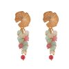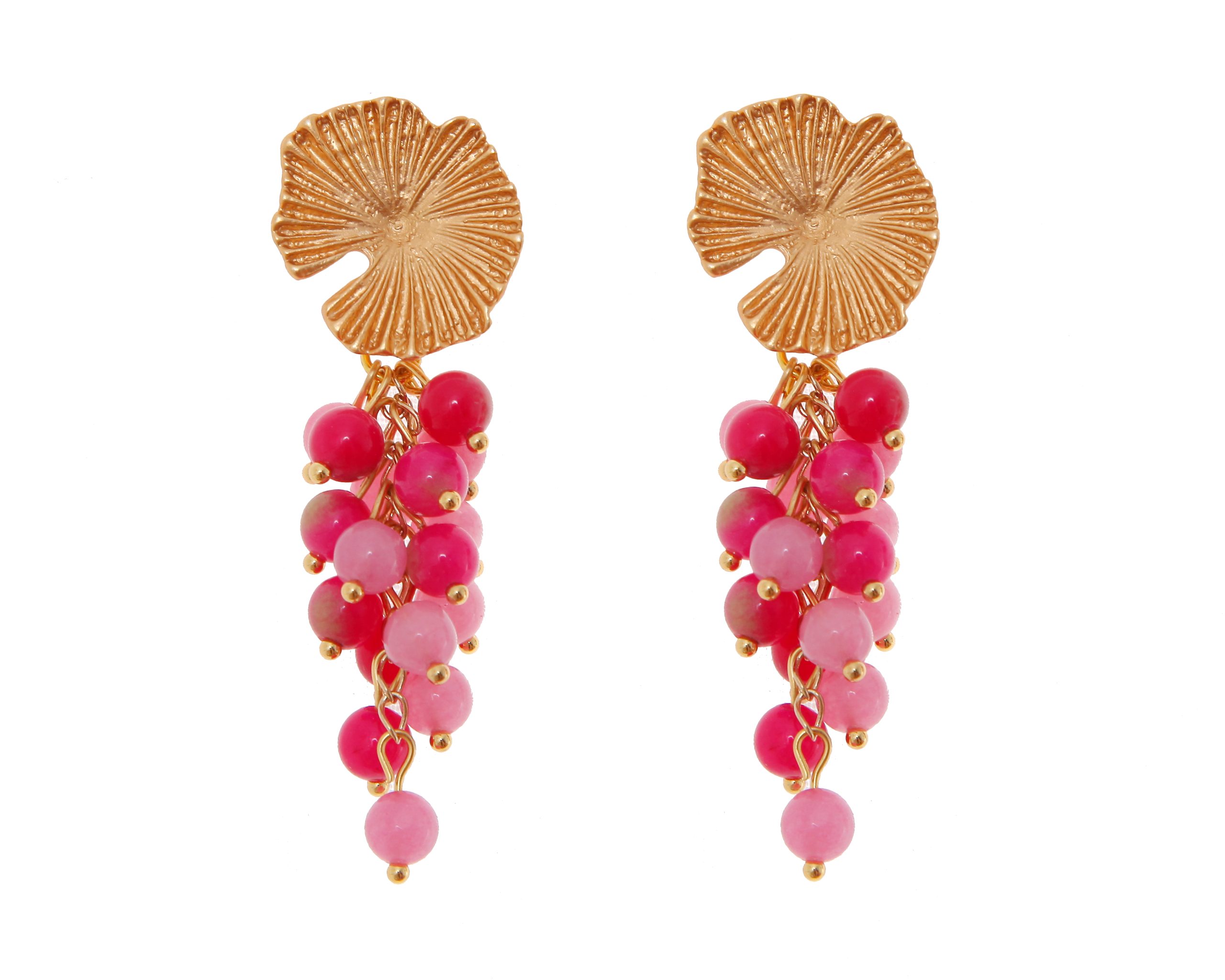 Pendientes de bolas de piedras Ágata en tonos de rosa con cabezal de nenúfar con acabado en oro mate. Cierre de tornillo. Medidas aproximadas ancho x largo, 25 x60mm (con cabezal). Fabricado artesanalmente en la provincia de Sevilla.