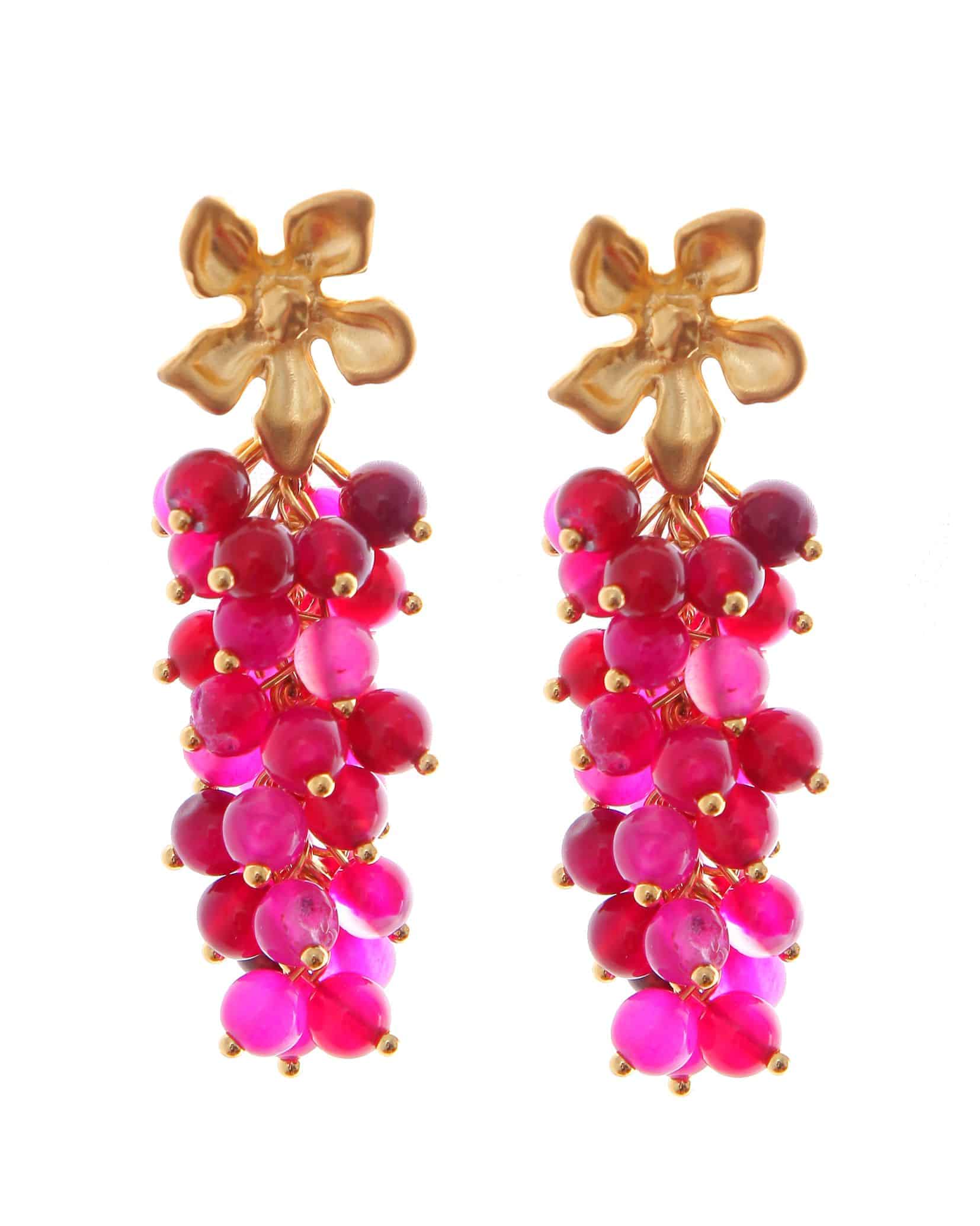Pendientes de bolas de piedras Ágata en tonos rosas con cabezal de flor con acabado en oro mate. Cierre de tornillo. Medidas aproximadas ancho x largo,15 x70mm (con cabezal). Fabricado artesanalmente en la provincia de Sevilla.