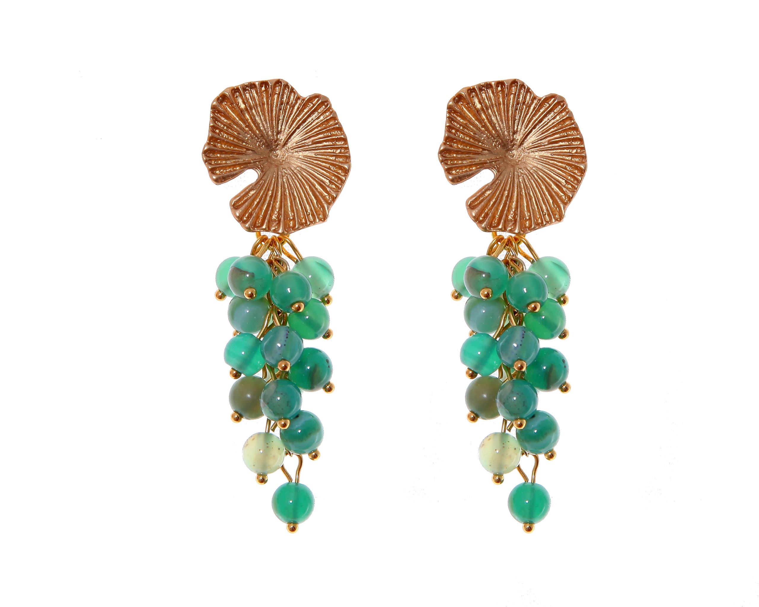 Pendientes de bolas de piedras Ágata en tonos verdes con cabezal de nenúfar con acabado en oro mate. Cierre de tornillo. Medidas aproximadas ancho x largo, 25 x60mm (con cabezal). Fabricado artesanalmente en la provincia de Sevilla.