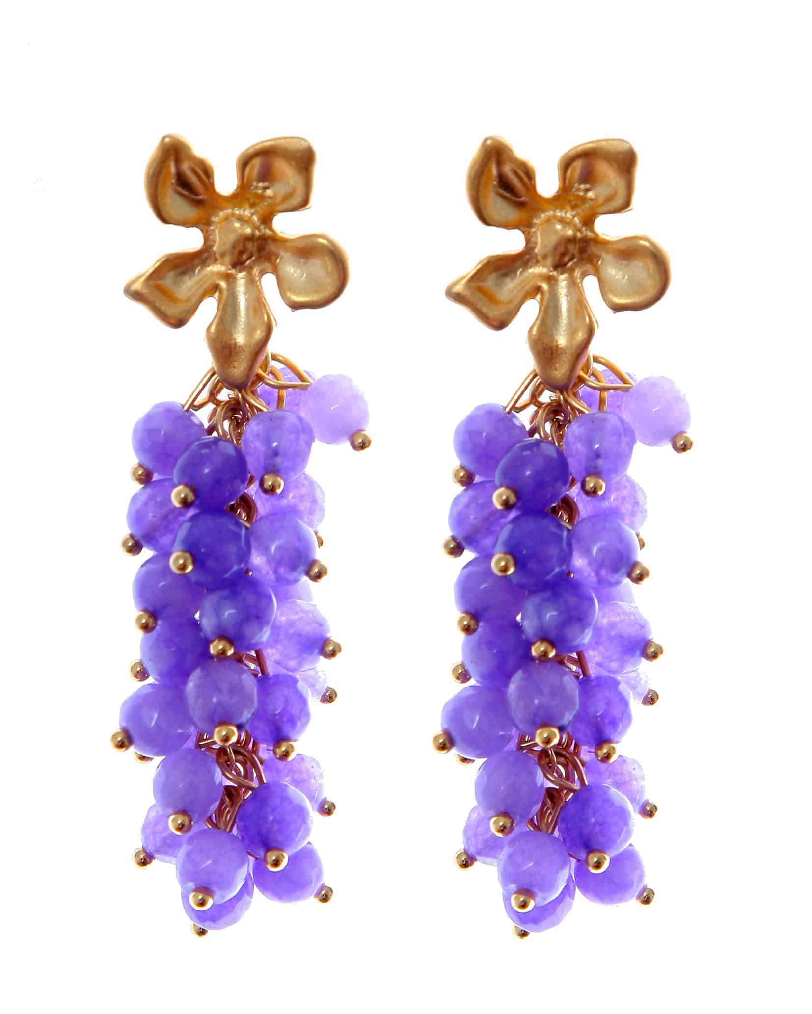 Pendientes de bolas de piedras Ágata lilas con cabezal de flor con acabado en oro mate. Cierre de tornillo. Medidas aproximadas ancho x largo,15 x70mm (con cabezal). Fabricado artesanalmente en la provincia de Sevilla.