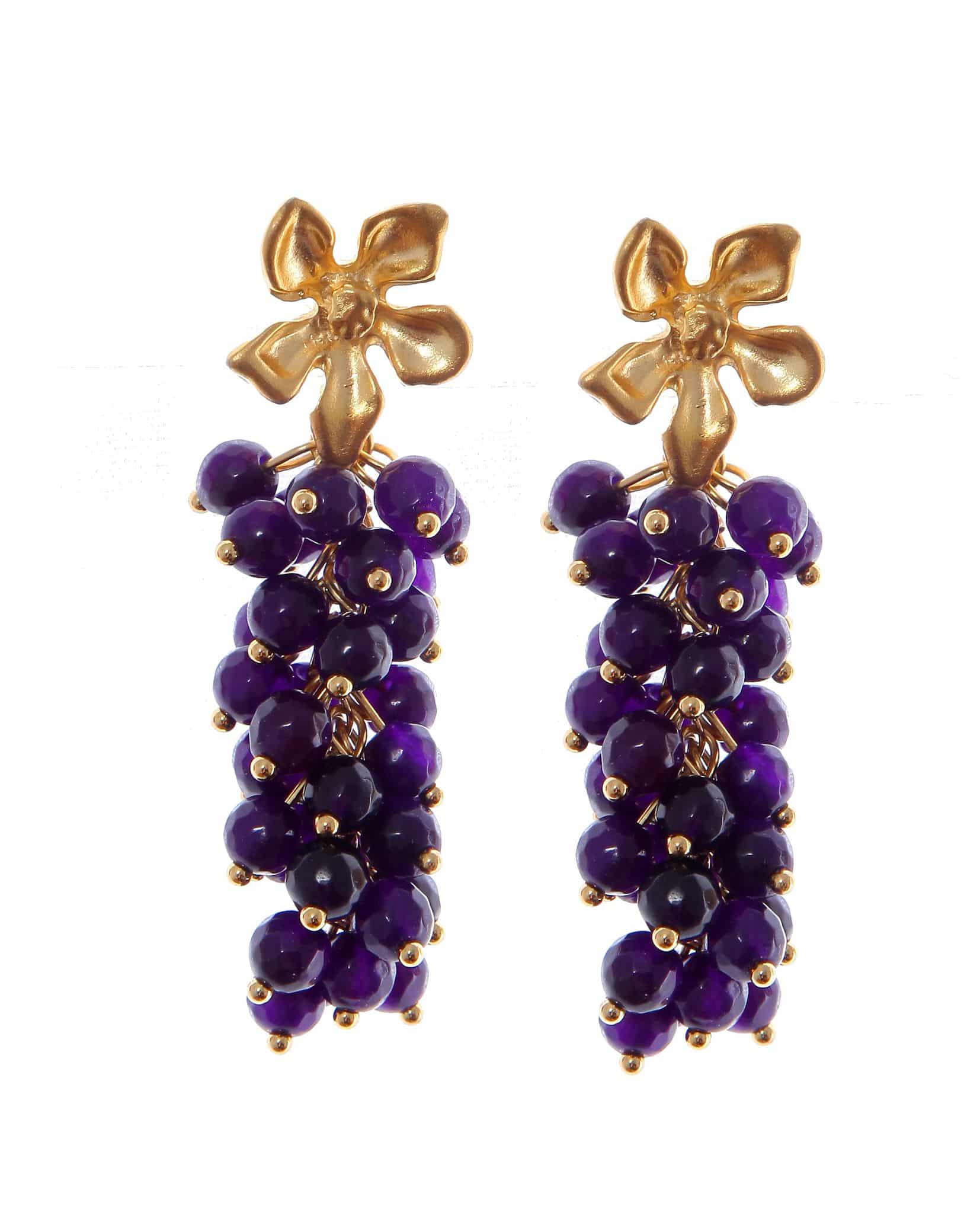 Pendientes de bolas de piedras Ágata moradas con cabezal de flor con acabado en oro mate. Cierre de tornillo. Medidas aproximadas ancho x largo,15 x70mm (con cabezal). Fabricado artesanalmente en la provincia de Sevilla.