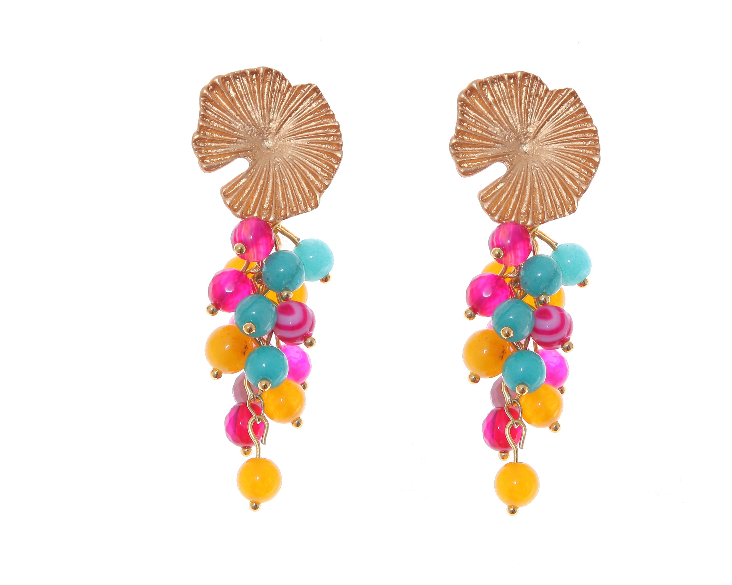 Pendientes de bolas de piedras Ágata mostaza, buganvilla y verde con cabezal de nenúfar