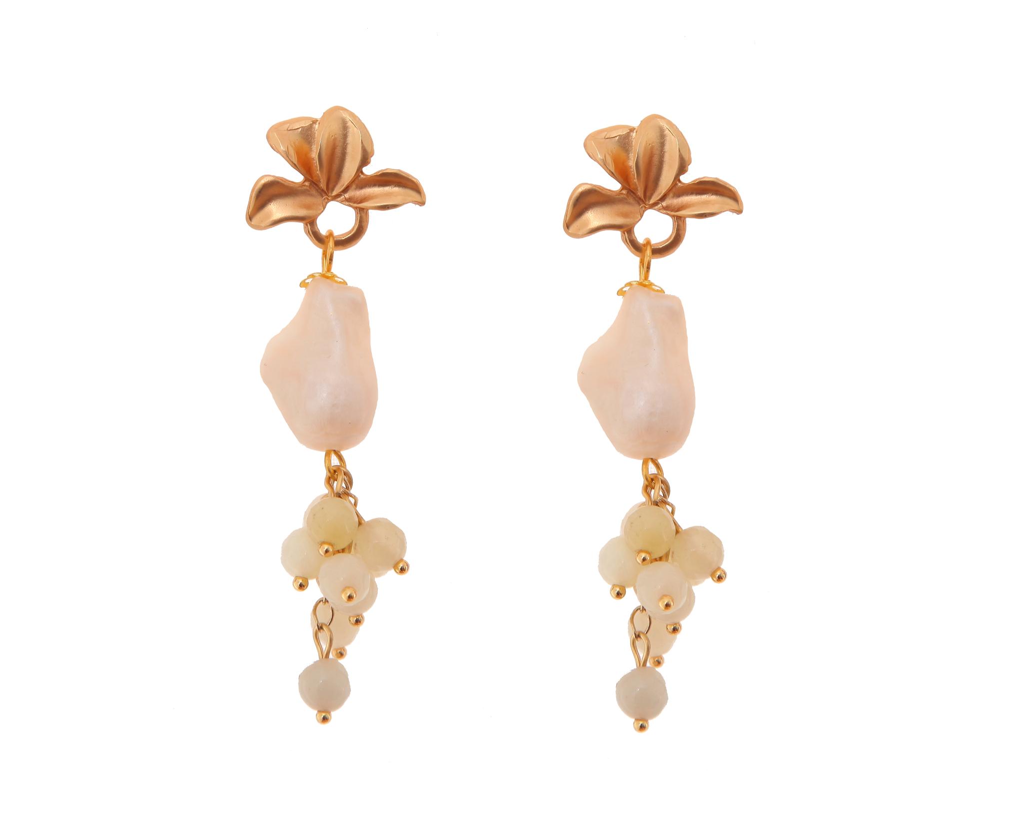 Pendientes de bolas de piedras Ágata y piedras nácar beige con cabezal de hojas