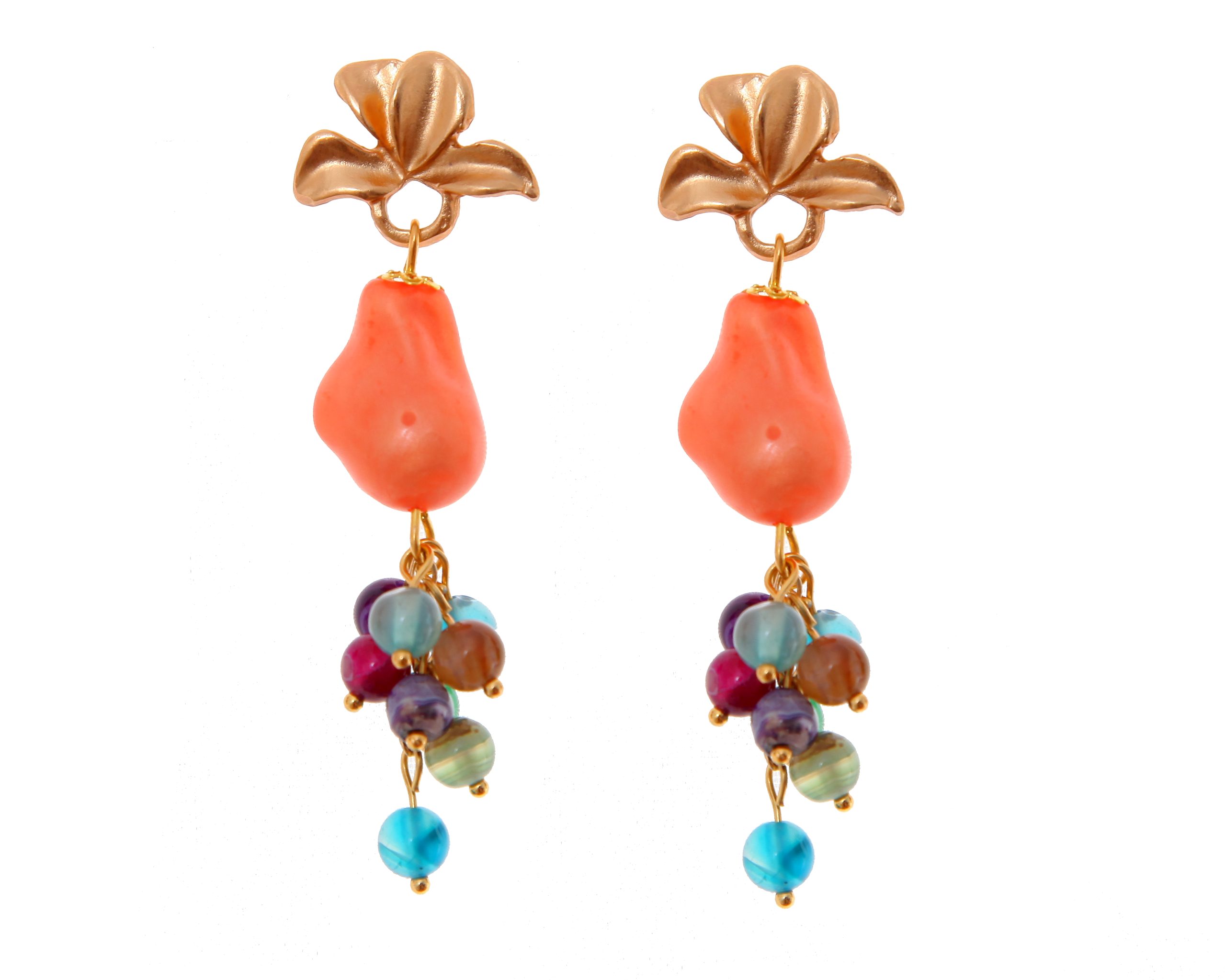 Pendientes de bolas de piedras Ágata y piedras nácar naranja y multicolores con cabezal de hojas