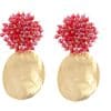 Pendiente dorado de dos esferas rosa con círculo labrado central y aplique dorado labrado