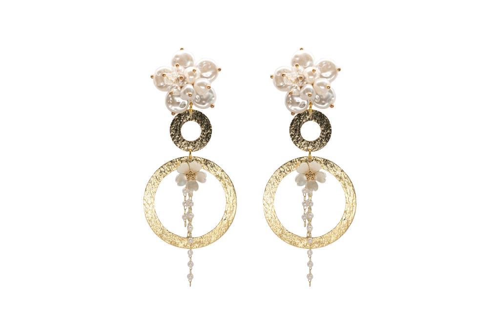Pendientes de doble aro dorado con aplique de perlas en forma de flor y adorno colgante