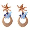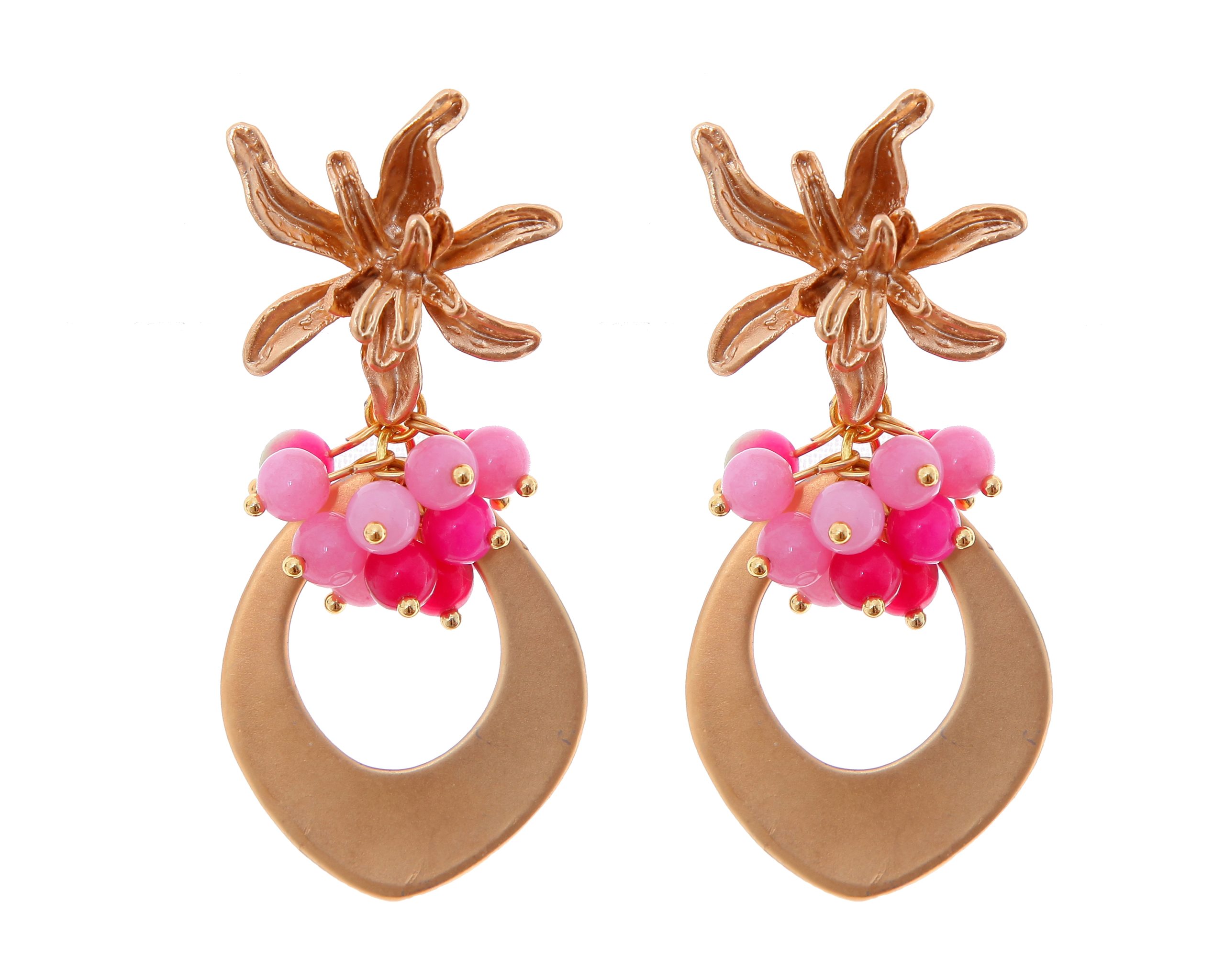 Pendientes de lágrima de oro con bolas de piedra Ágata en tonos de rosa y cabezal de flor