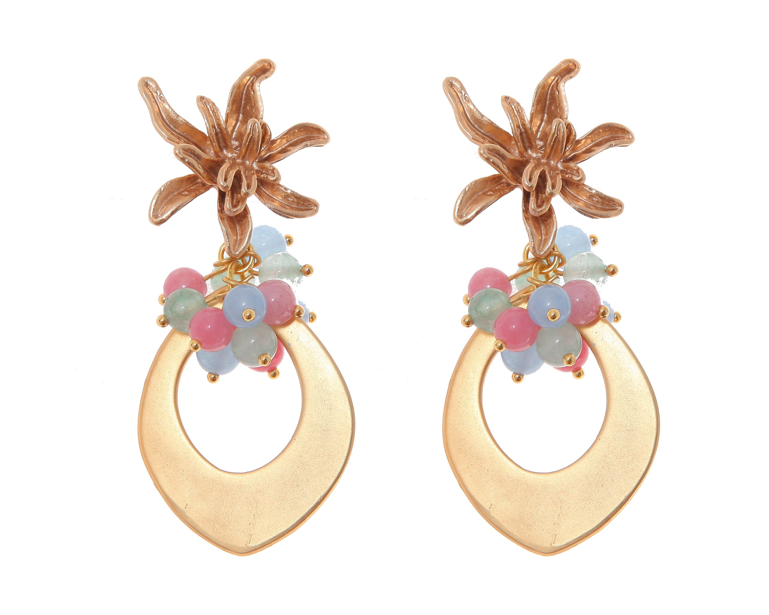 Pendientes de lágrima de oro con bolas de piedra Ágata en tonos pastel y cabezal de flor