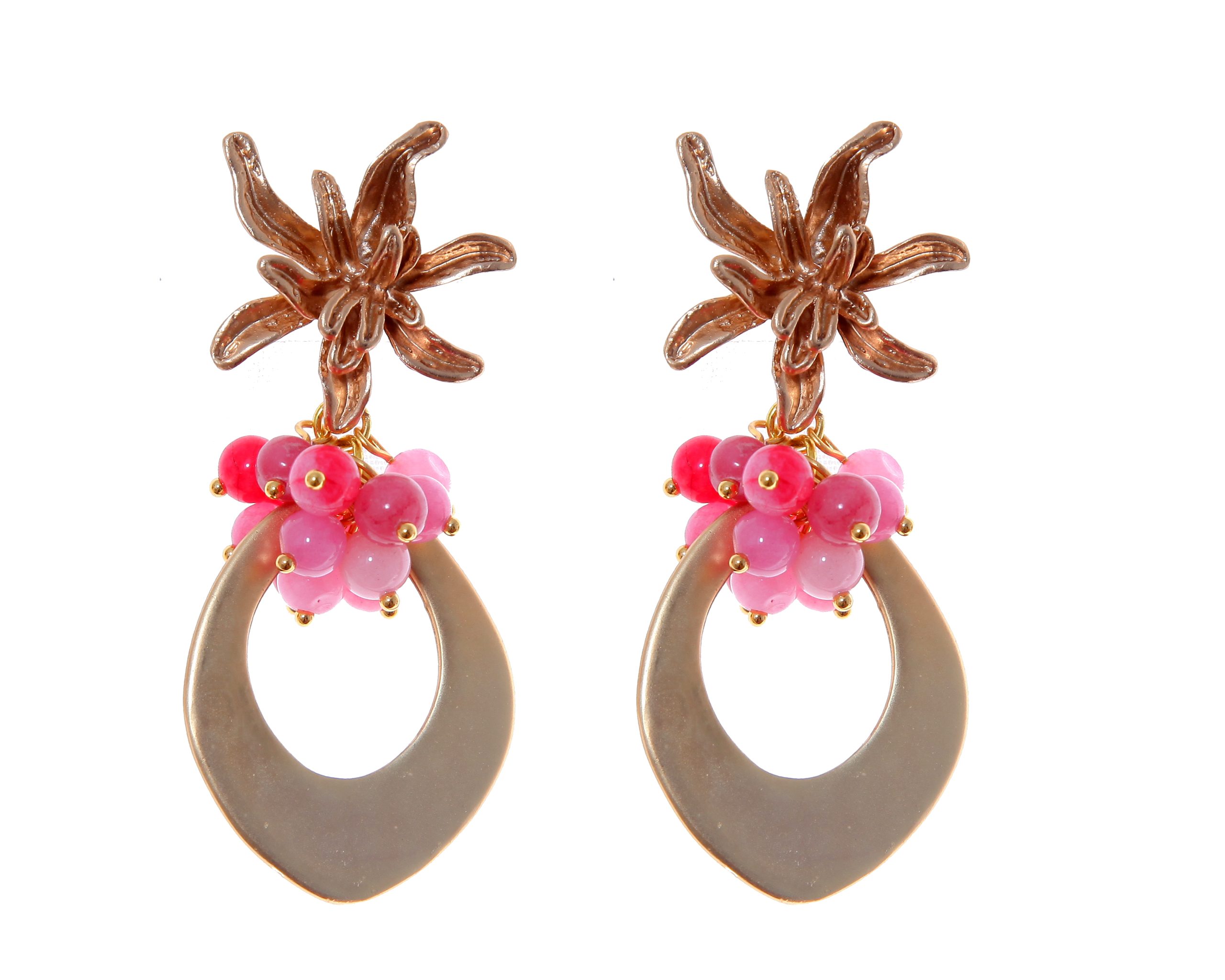 Pendientes de lágrima de oro con bolas de piedra Ágata en tonos rosas y cabezal de flor