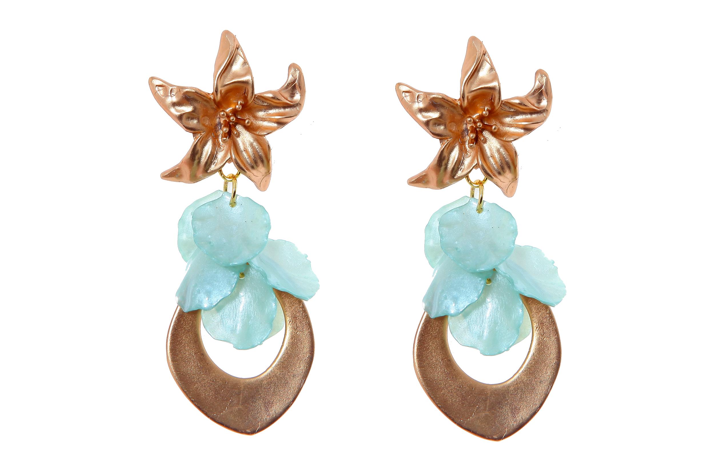 Pendientes de lágrima de oro con pétalos en color verde jabonoso con cabezal de flor
