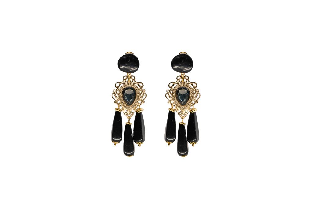 Pendientes colgantes con cabezal circular en negro brillante. Diseño central con filigrana dorada que enmarca una piedra negra en forma de lágrima. Tres colgantes alargados de resina negra completan el diseño, aportando movimiento y elegancia. Cierre omega. Medidas aproximadas: 2,5 x 7,8 cm (con cabezal incluido).