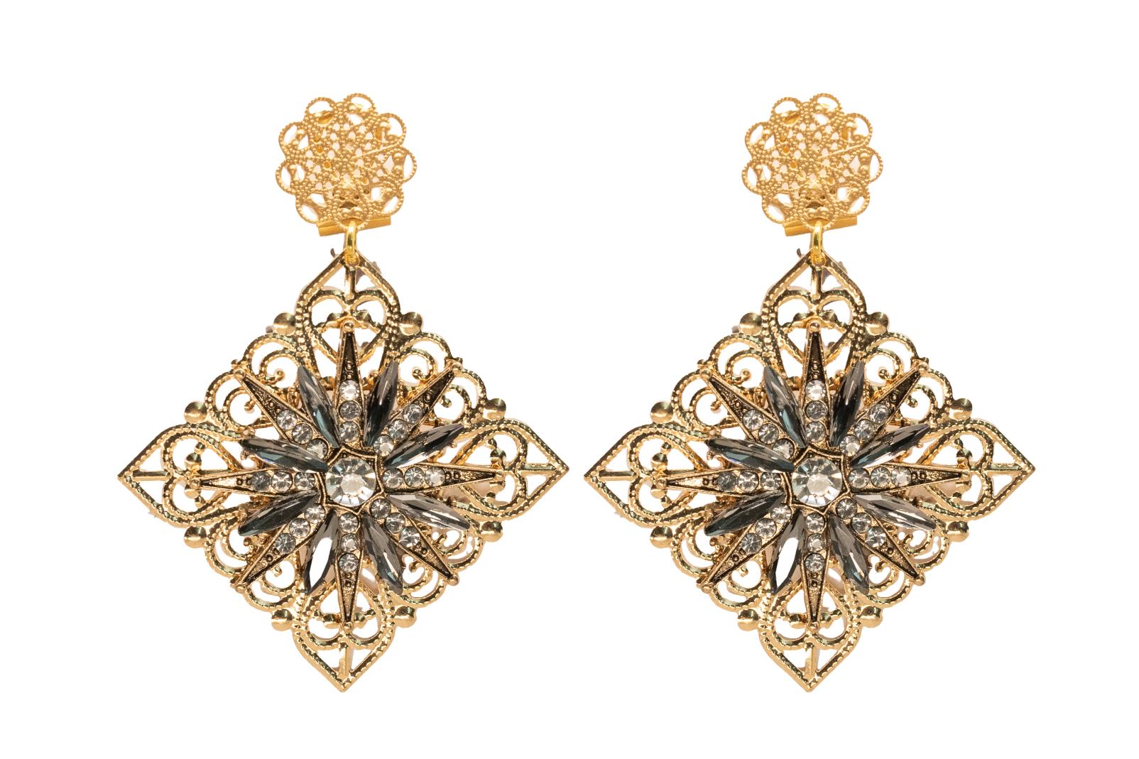 Pendientes colgantes de forma romboidal con diseño calado en dorado, decorados con un motivo central de estrella formado por cristales transparentes y alargados en tonos grisáceos. Cabezal redondo con detalle calado que complementa el diseño. Cierre omega. Medidas aproximadas: 5,5 x 7,5 cm (con cabezal incluido).