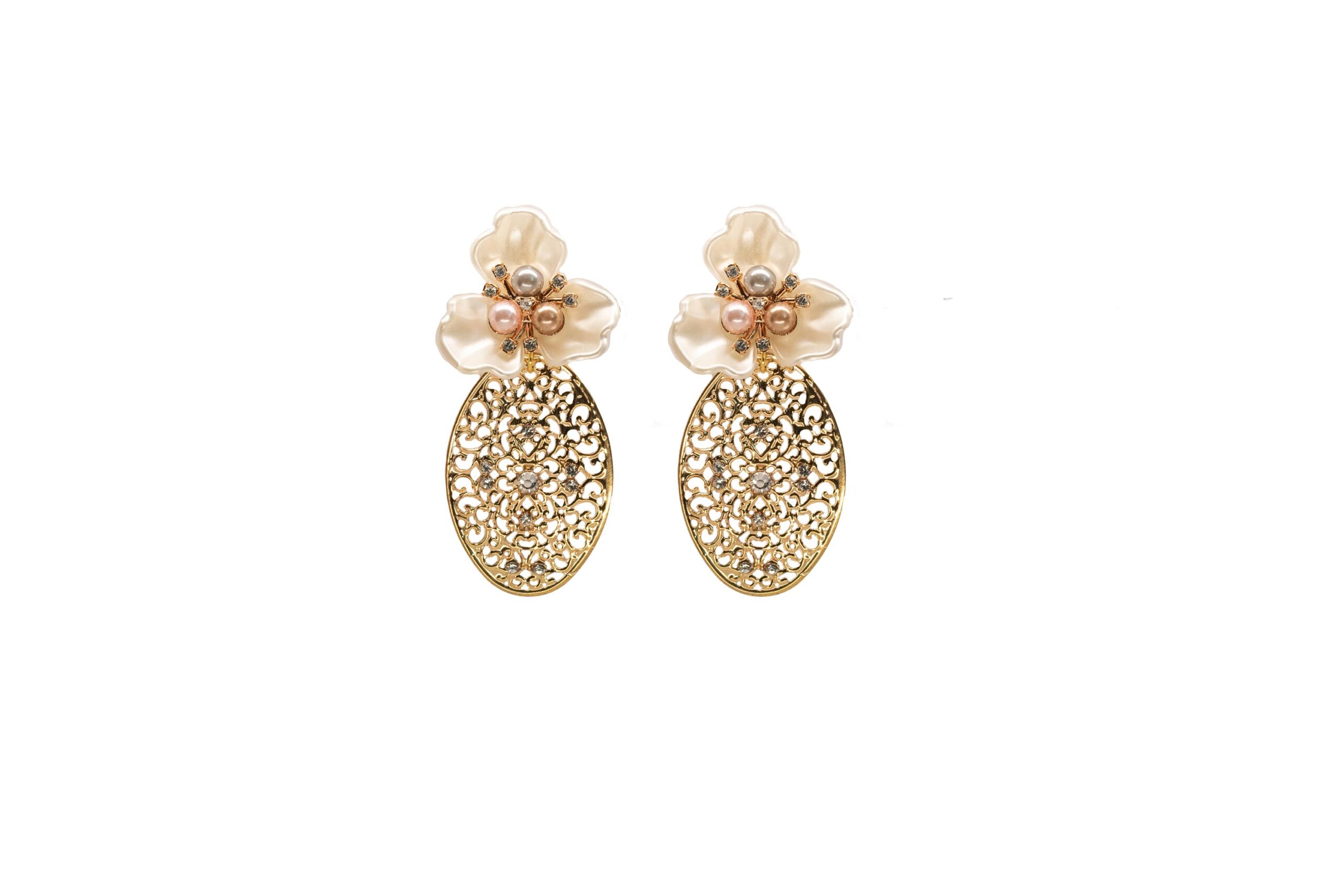 Pendientes de metal ovalados con cabezal de flor con pétalos nacarados