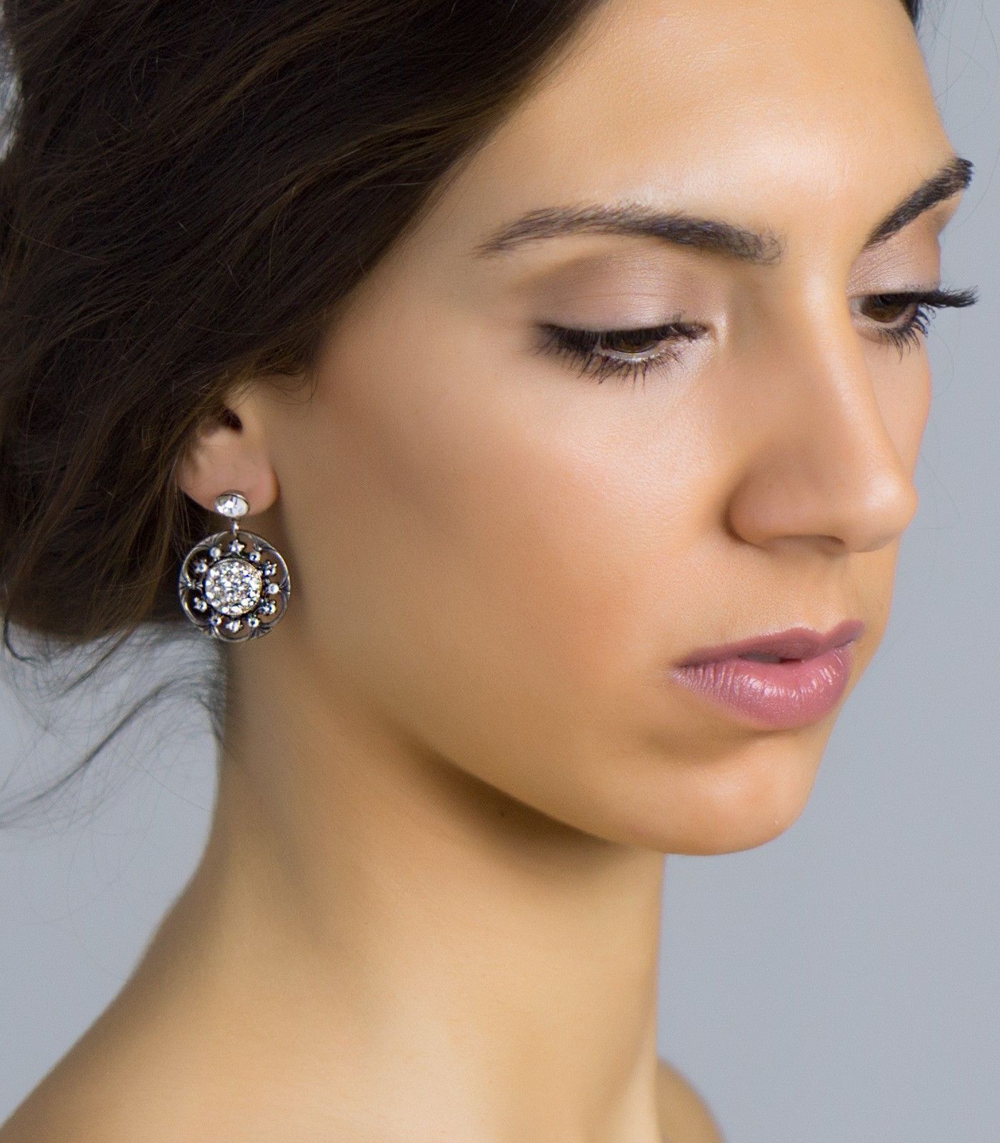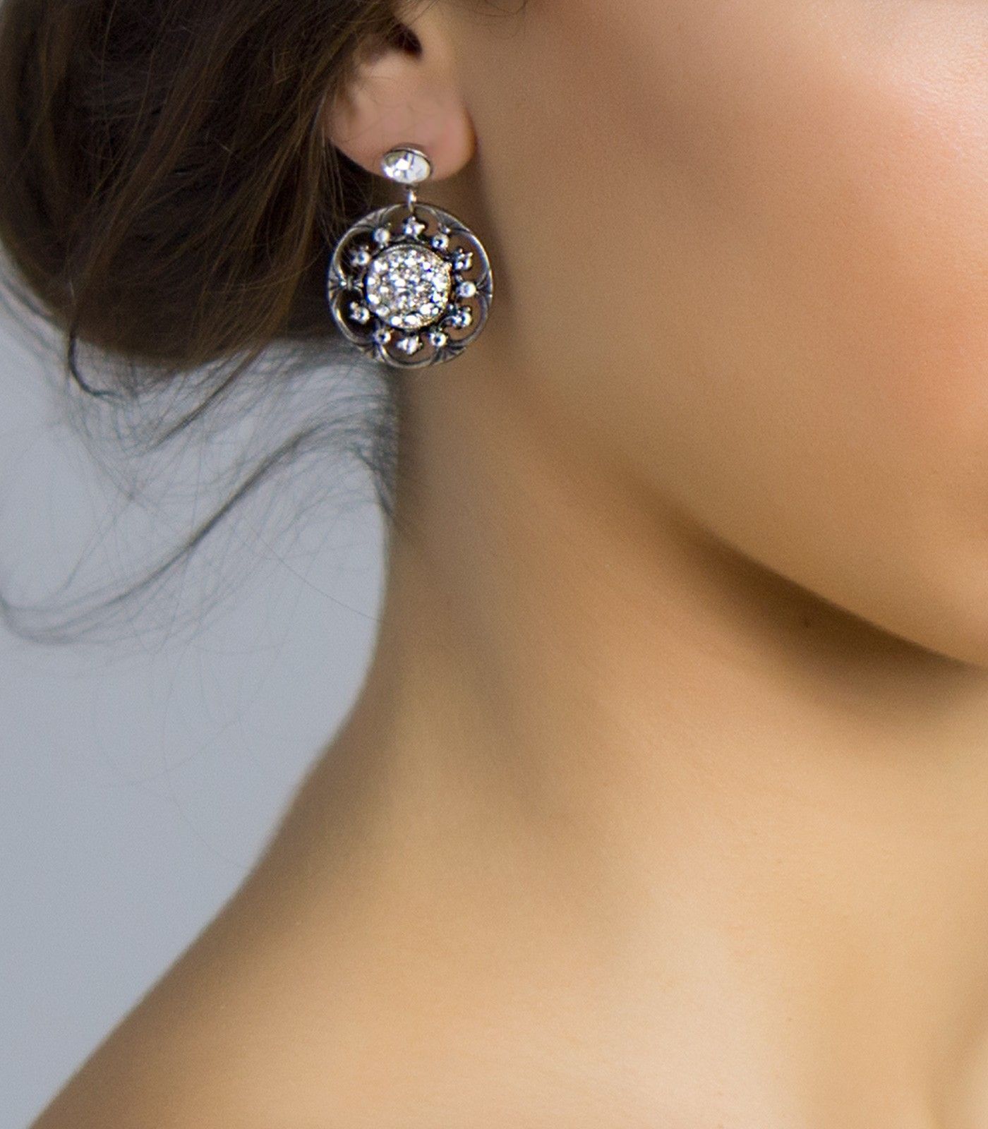 Pendientes en forma redonda con fornitura metálica. Contiene cristal de Swarovski.
