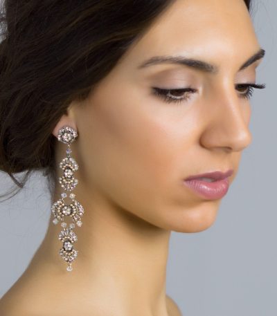 Pendientes con fornitura metálica, pedrería y cristal Swarovski.