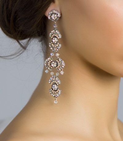 Muy elegantes y sencillos son estos pendientes tipo cadena con tacha en forma de abanico adornada de cristal Swarovski. El resto de la pieza se compone de figuras metálica simulando abánicos con incrustaciones de Swarvoski. Cuelgan del pendiente pedrería de pequeño tamaño en forma de rombo. Para las amantes de los pendientes largos, estos son una apuesta segura. Ideales para llevar con un vestido sencillo y también para madrinas.