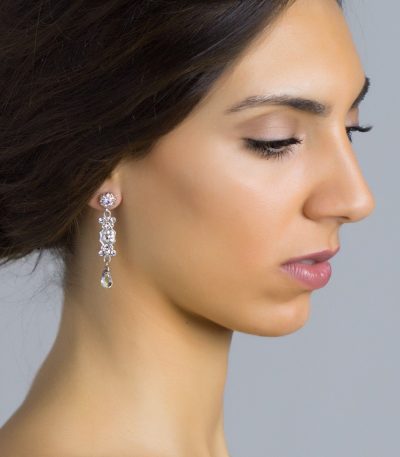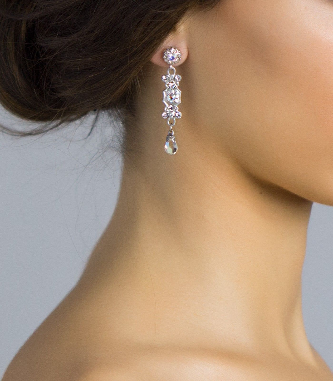 Discretos pendientes en forma alargada con incrustaciones de cristal Swarovski. Cuelga de la pieza cristal de pequeño tamaño. Perfectos tanto para las que se suben al altar como para las madrinas. Sencillos y elegantes.