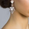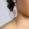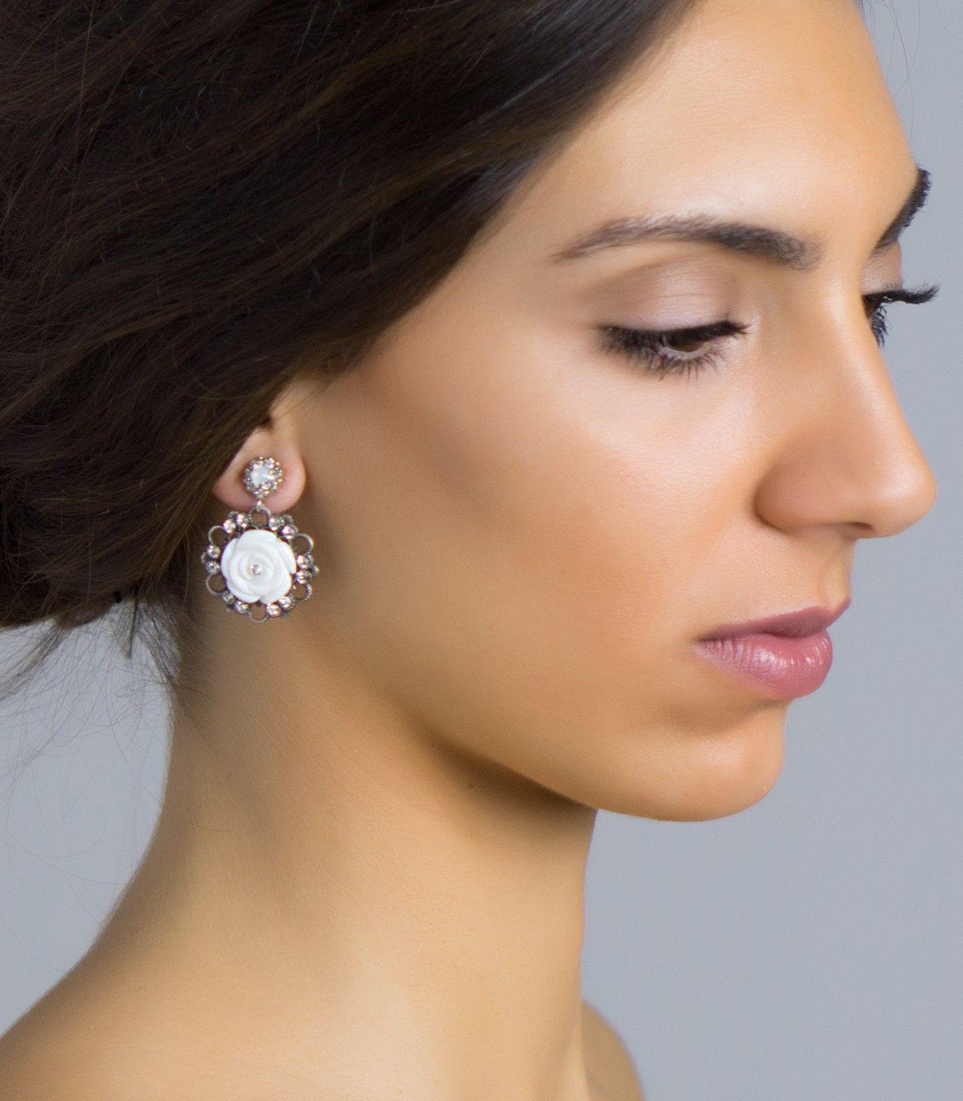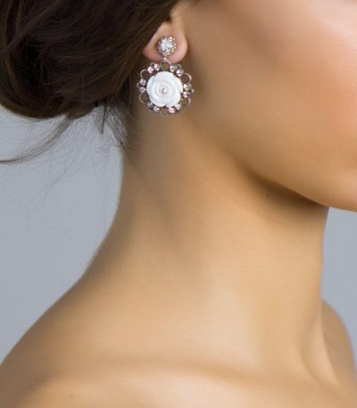 Pendientes de tacha redonda con cristal Swarovski. La pieza está formada por flor de fornitura metálica con rosa blanca en el interior. Complemento ideal para combinar con un hermoso ramo de flores blancas. Buena combinación para vestido de novia con hombros descubierto para hacer brillar a esta hermosa pieza. Idóneos para madrinas amantes del aspecto floral y vestidos elegantes con colores vivos.