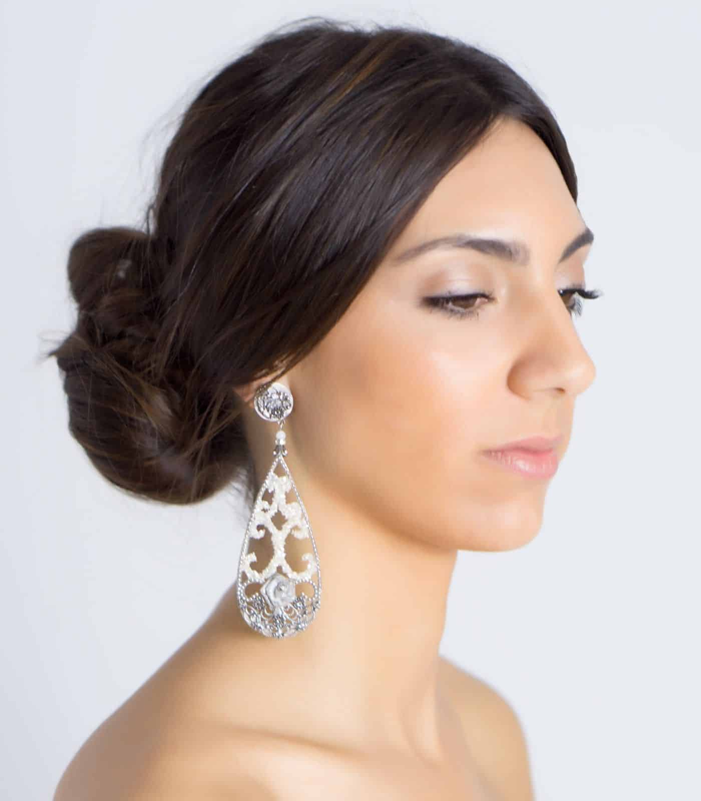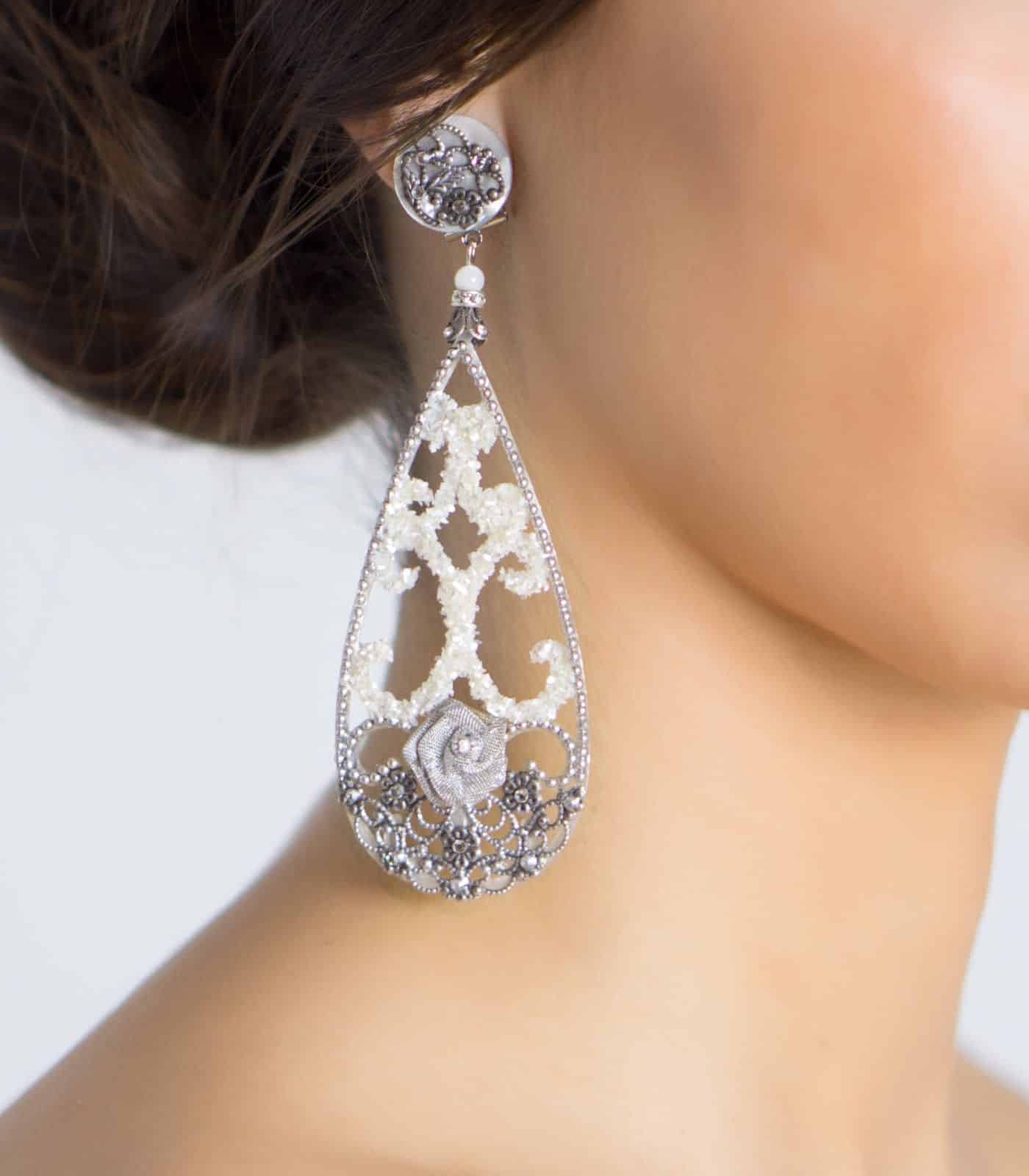Original lágrima compuesta de color blanco y plateado. En el final de la pieza aparece una pequeña rosa plateada. De aspecto envejecido. Para las amantes de el estilo añejo y lo llamativo.