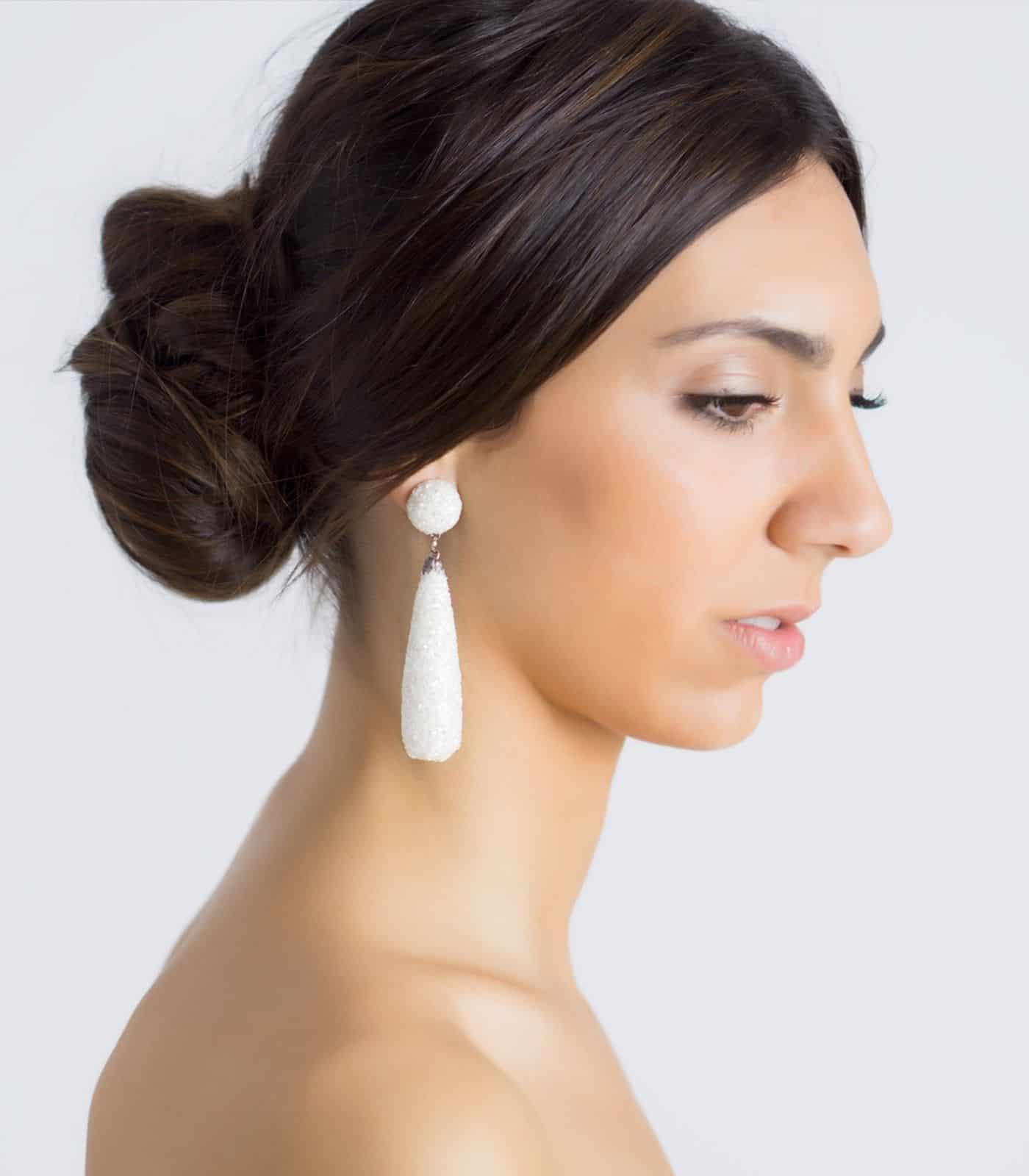Pendiente de gran tamaño formado por tacha redonda de nácar y lágrima aplastada de nácar. Contraste entre sencillez y tamaño. Perfectos para lucir con la cara despejada.