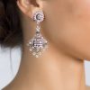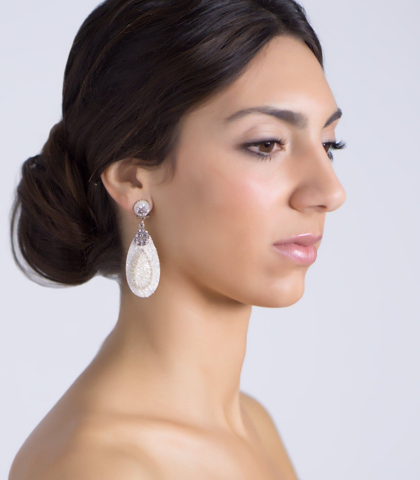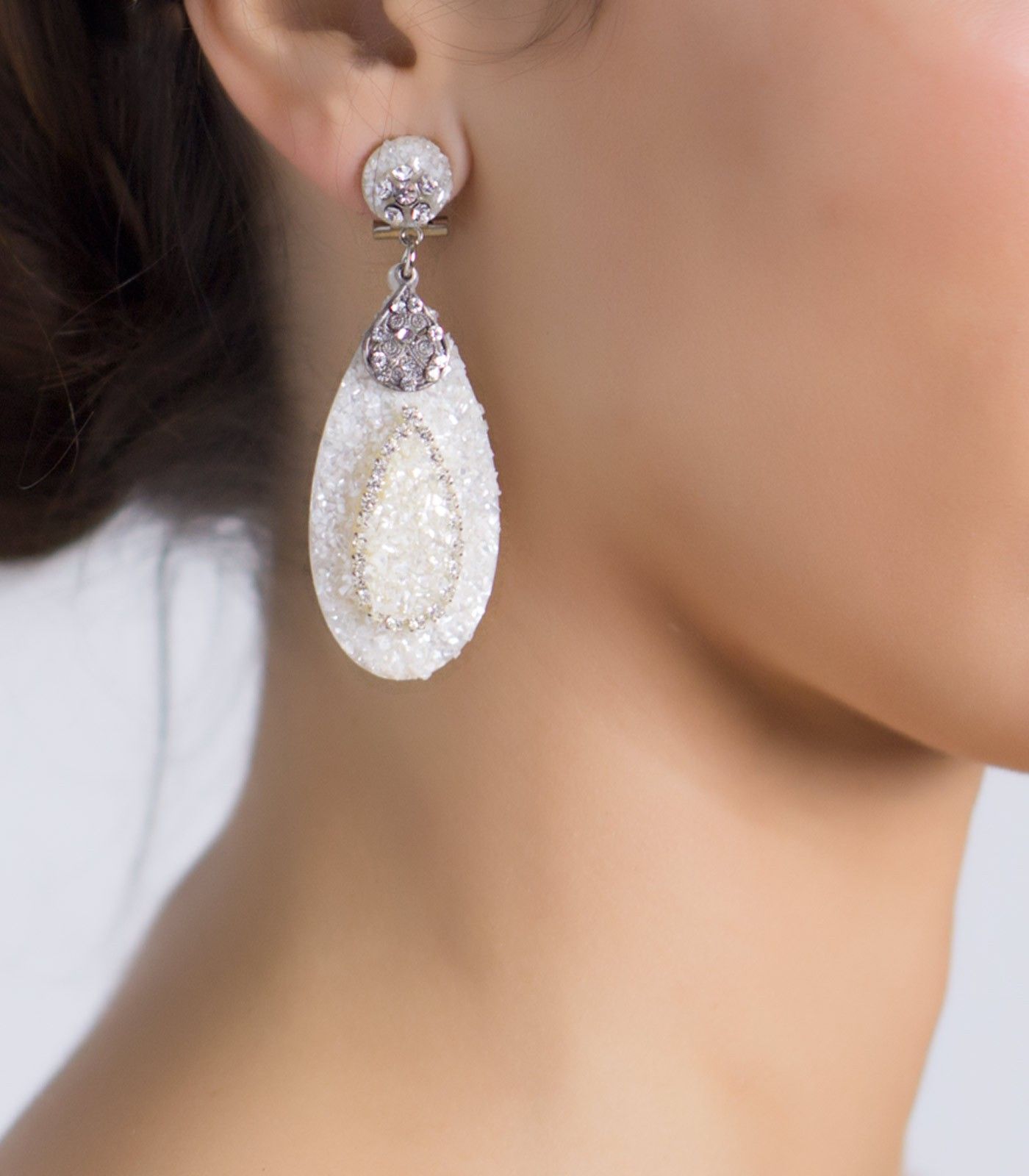 Tacha de nácar blanca adornada con cristal Swarovski. La lágrima es de nácar compuesta por otra lágrima de menor tamaño en su interior. Contraste entre el blanco reluciente y el blanco hueso de la lágrima interior. Para las que apuestan por la sencillez con un toque sofisticado.