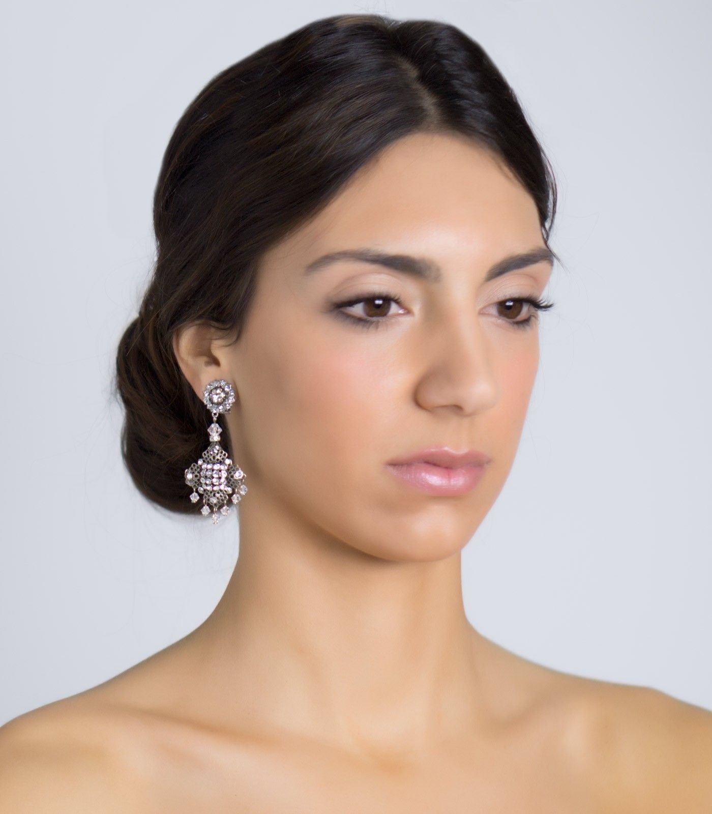 Elegantes pendientes con tacha en forma de flor adornada con cristal Swarovski. El cuerpo de la pieza está formado por una majestuosa fornitura metálica en forma de rombo e incrustaciones de cristal Swarovski. Cuelga de la pieza pequeños cristales en forma de rombo. Muy sofisticados y elegantes para combinar con cualquier vestido de novia.